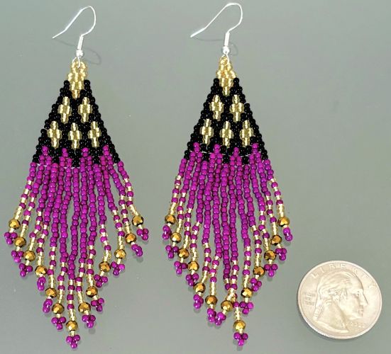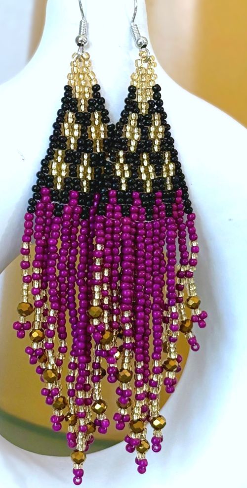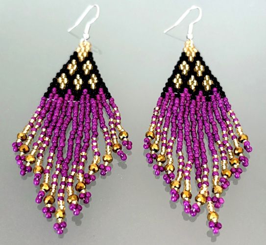 Introducing our stunning hand beaded tassel earrings in an elegant purple, black and gold color scheme. They are definitely elegant enough to wear on date night with a snazzy little dress! These earrings are the perfect accessory for anyone looking to add a touch of Bohemian elegance to their outfit. The glass seed beads used to make these earrings include shiny purple (red bias), shiny black and metallic gold. There are fancy faceted gold beads at the end of each 13 tassels. Handcrafted with love and care, each pair is uniquely made, ensuring that you stand out from the crowd.