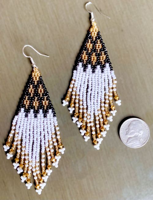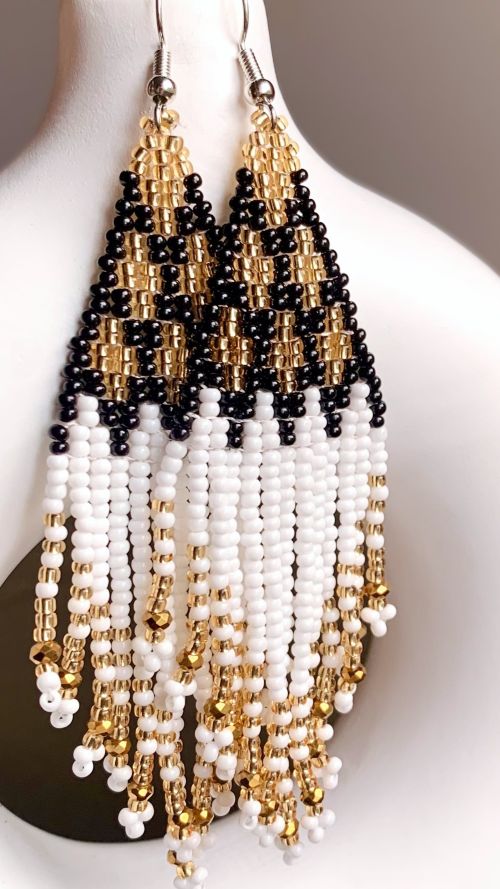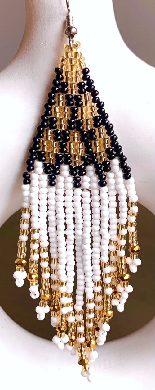 Introducing our stunning hand beaded tassel earrings in an elegant white, black and gold color scheme. They are definitely elegant enough to wear on date night with a snazzy little dress! These earrings are the perfect accessory for anyone looking to add a touch of Bohemian elegance to their outfit. The glass seed beads used to make these earrings include shiny black and metallic gold. Handcrafted with love and care, each pair is uniquely made, ensuring that you stand out from the crowd.