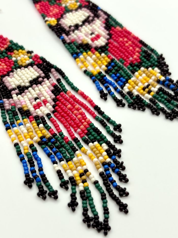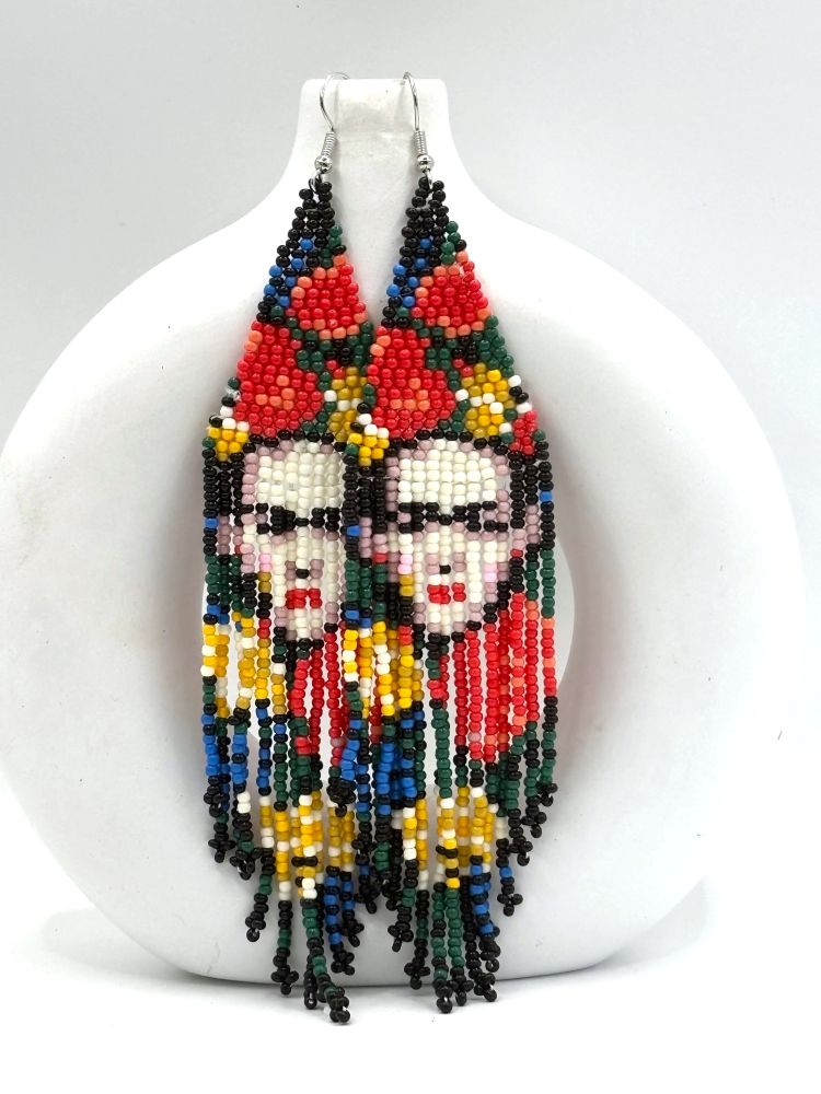 These hand beaded tassel earrings beautifully capture the iconic image of Frida Kahlo, surrounded by a vibrant array of flowers that celebrate her unique spirit. Each earring is meticulously crafted with intricate beadwork, ensuring every detail reflects the artistry and passion associated with Kahlo’s legacy. Eye-catching and comfortable in weight and, they add a bold, colorful statement to any outfit while honoring a timeless cultural icon. Perfect for those who appreciate handcrafted jewelry with meaningful design, these earrings bring both elegance and personality to your accessory collection.