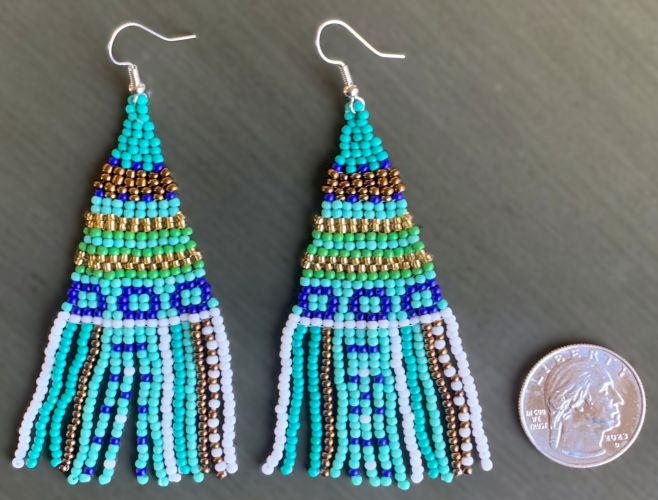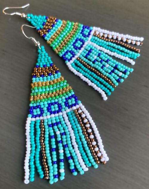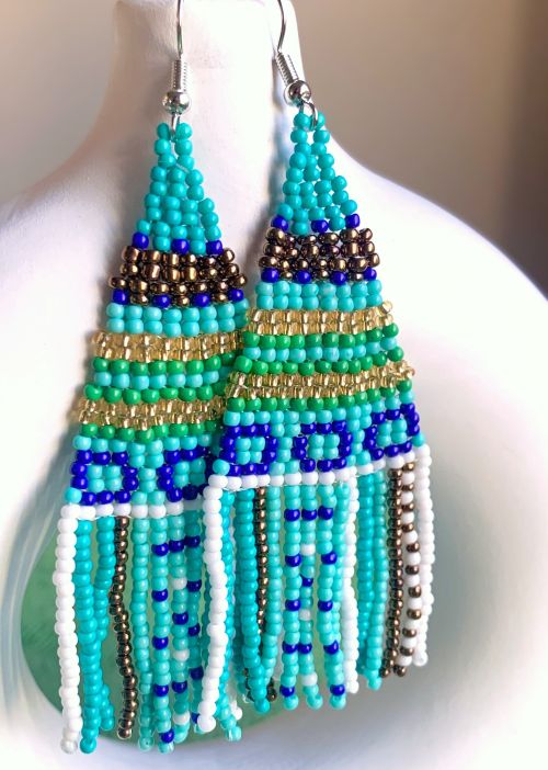 These Boho earrings feature a delightful mix of colors that will complement any outfit, whether you're dressing up for a festival or adding a touch of fun to your everyday look. They feature seven different colors of seed beads; three shades of teal/green, metallic copper, metallic gold, white and cobalt blue. Made from high-quality materials, these earrings are lightweight and comfortable, making them perfect for all-day wear.