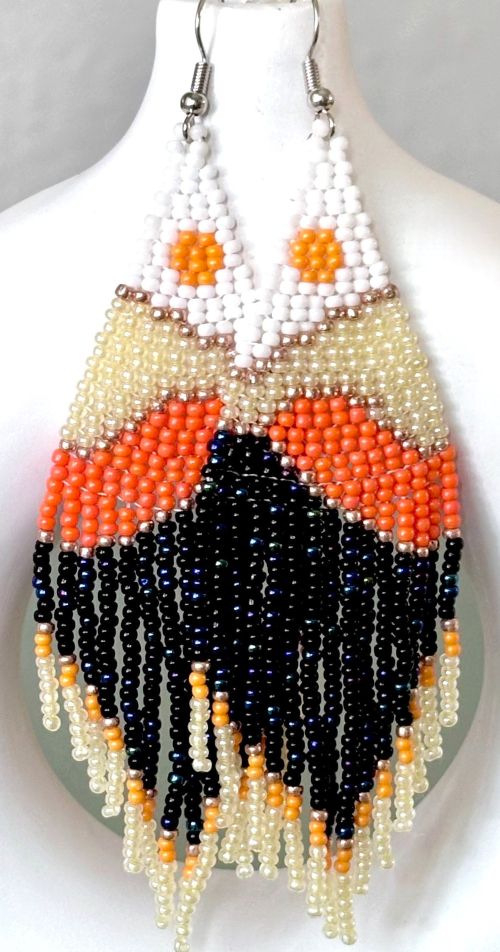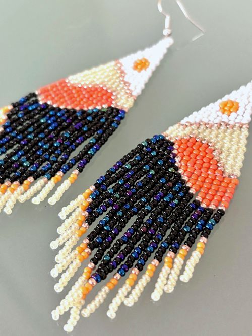 Designed for the free-spirited, our Boho earrings feature a delightful tassel design that sways gently with your every movement, adding a playful touch to any outfit. Whether you're dressing up for a festival, a casual day out, or simply want to add a pop of color to your everyday look, these earrings are the perfect choice. The hand beaded details reflect the beauty of nature, reminiscent of the sun shining over the land. These earrings feature six different colors of seed beads; pearlescent cream, vibrant orange, light orange, white, metallic copper and black with blue 'peacock' beads mixed in to add a stunning effect. A striking color combination!