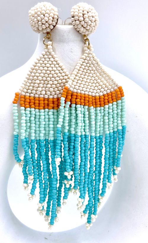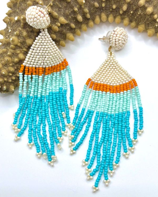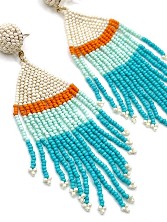 These hand beaded earrings showcase a stunning color gradient and fifteen tassels that sway gracefully, capturing attention with every movement. The post-back design features an ivory beaded circle from which beads cascade into the dangle section. The colors transition beautifully from ivory to vibrant orange to pastel turquoise and turquoise, finishing with a trio of ivory beads at the tip of each tassel. These earrings are lightweight and designed for comfortable wear throughout the entire day.