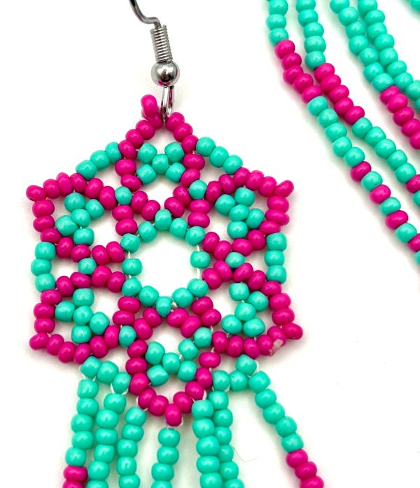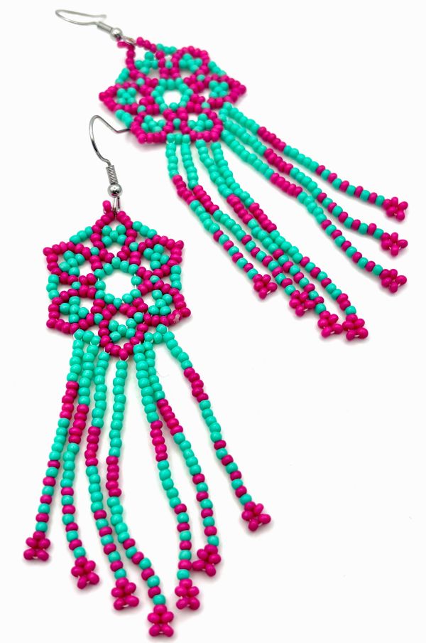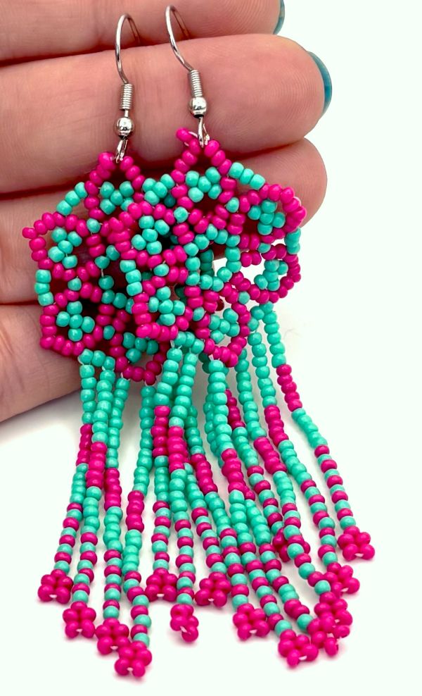 These stunning hand-beaded tassel earrings showcase a detailed flower design with eight delicate tassels hanging beneath. Featuring a lively combination of matte teal and pink seed beads, they add a pop of color to any outfit. Perfect for both casual and dressy occasions, each pair is carefully handcrafted with attention to detail, making every set one-of-a-kind and sure to make you shine.