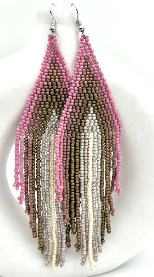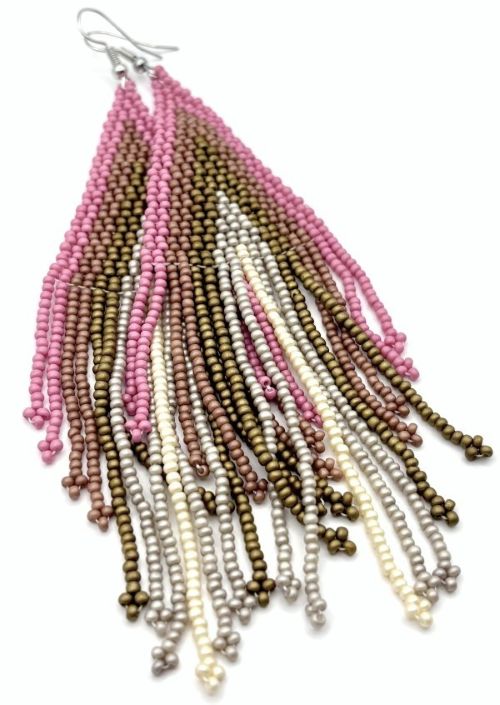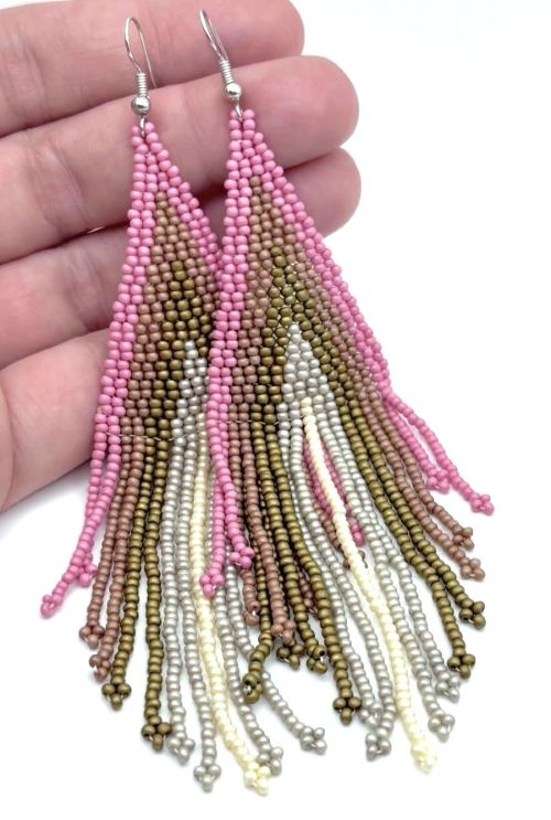 Each pair is meticulously hand beaded with care, ensuring that every detail shines through. There are five colors of glass seed beads used in these earrings. First is pink, followed by two rows of a nude pinkish brown color, matte gold, light silvery gray and ending with a single tassel of warm white. These earrings are a very comfortable weight, designed for all-day wear.