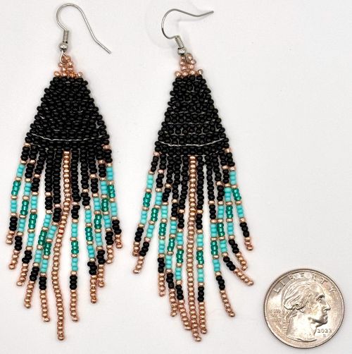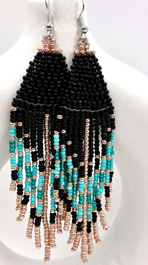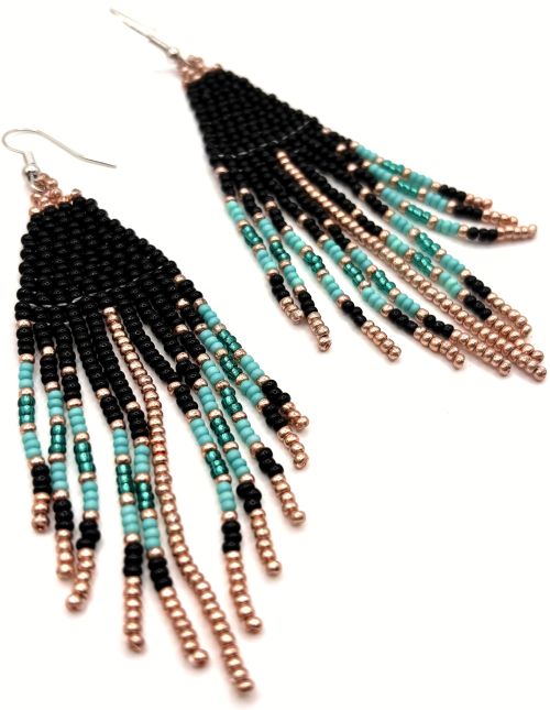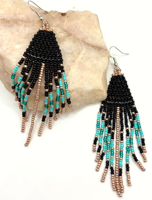 Introducing our stunning hand beaded tassel earrings in an elegant blend of black, turquoise, teal, and metallic copper. These earrings are the perfect accessory for anyone looking to add a touch of Southwestern flair to their outfit. Handcrafted with love and care, each pair is uniquely designed to showcase the beauty of artisanal craftsmanship.