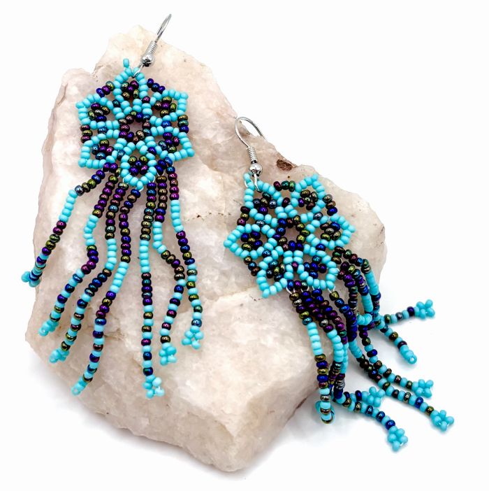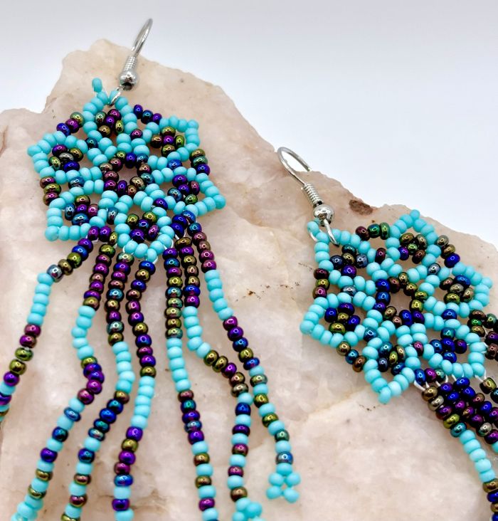 These exquisite hand-beaded tassel earrings feature an intricate flower pattern with eight graceful tassels dangling below. The vibrant blend of matte turquoise and shimmering iridescent black "peacock" seed beads brings a striking splash of color to your look. Designed to catch and reflect light beautifully, they add a captivating sparkle to any ensemble.