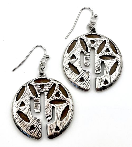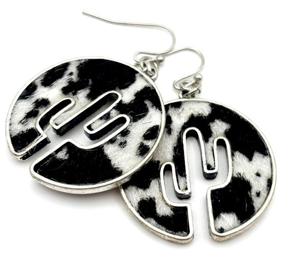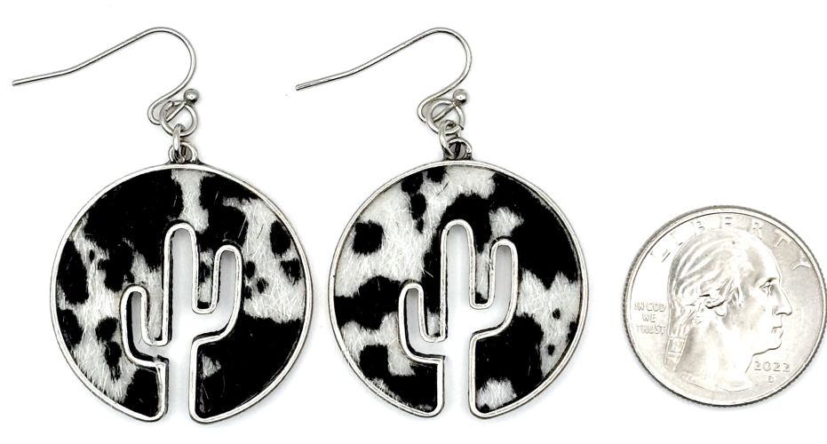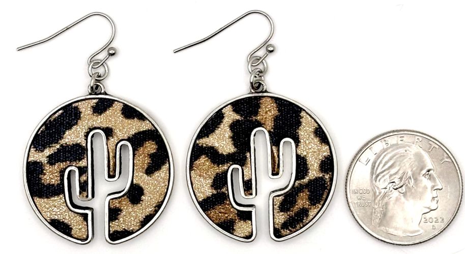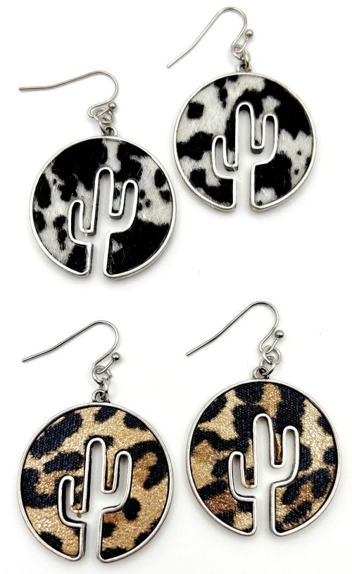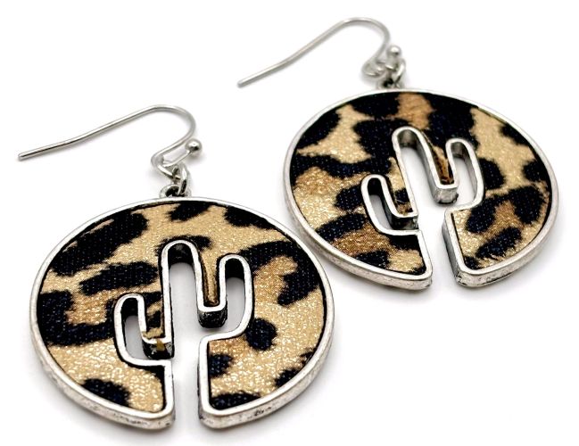 These fun earrings are perfect for adding a touch of the West to your outfit! This fun design features a round silver tone body with an outline of a Saguaro cactus. The round earring is decorated with either your choice of leopard print or faux cow hide.