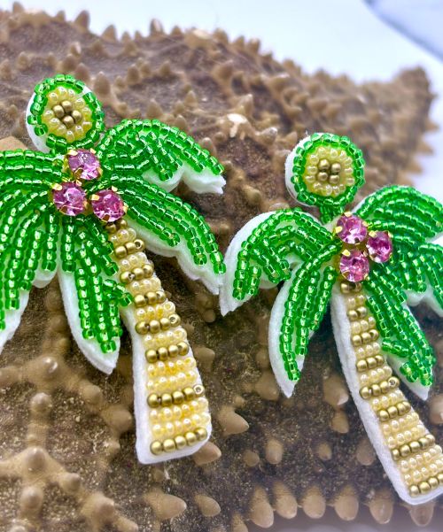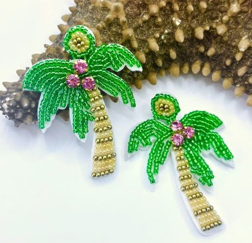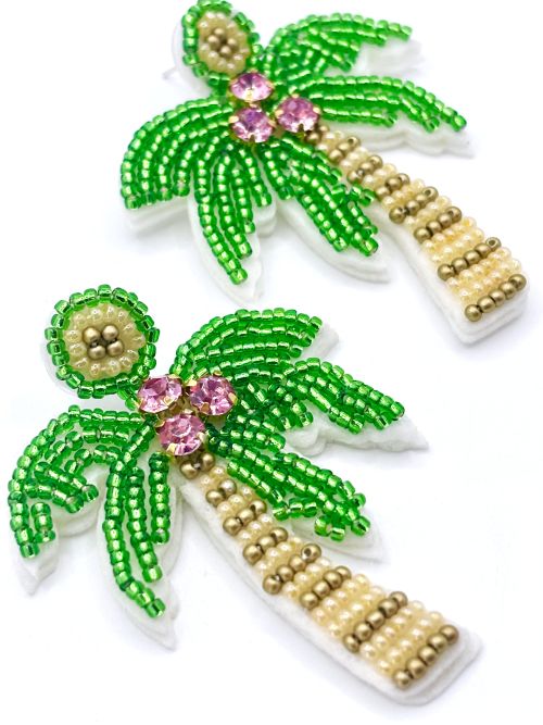 These hand beaded palm tree earrings have a lot of charm! Hand beaded on a thick white felt foundation, these earrings are so light you'll forget you're wearing them. With seed beads in shiny bright green, matte gold and pearlescent cream, these have beautiful sparkle, especially when catching the sunlight. Three shimmering pink rhinestones are the "coconuts", adding yet more eye-catching appeal!
