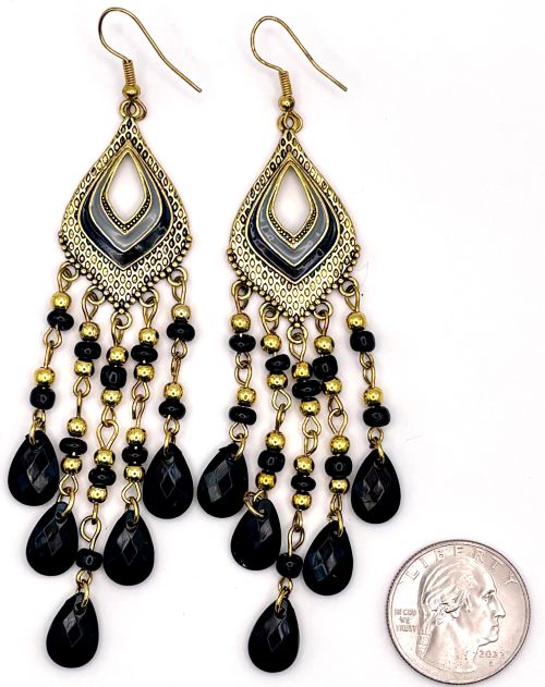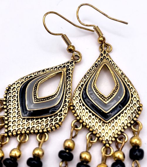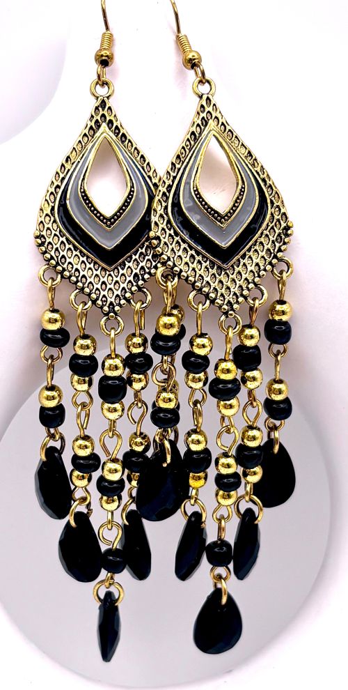Introducing our stunning black and gold beaded tassel dangle earrings, the perfect accessory to elevate any outfit! These earrings are designed to make a statement, featuring a chic combination of black and gold that effortlessly blends elegance with a touch of fun.