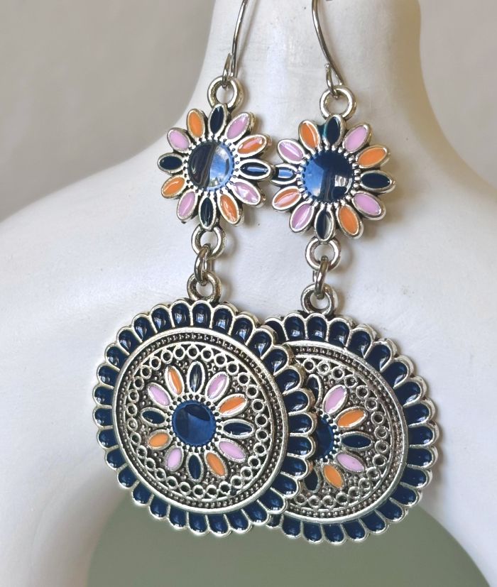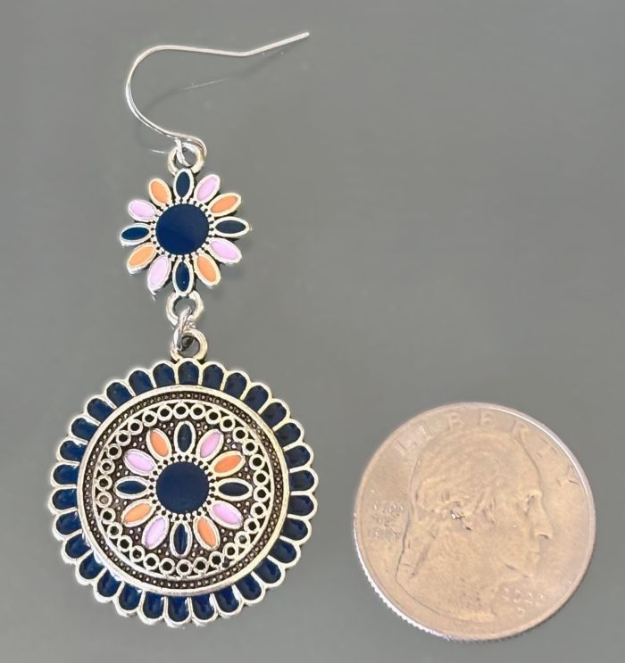 Capture the spirit of the Southwest with these Bohemian-inspired earrings. They showcase enameled accents with beautiful color combination of navy, orange, and soft pink. The design features a delicate daisy at the top, from which a larger circle dangles, echoing the same floral motif at its center. These earrings add a unique, colorful touch to any outfit.
