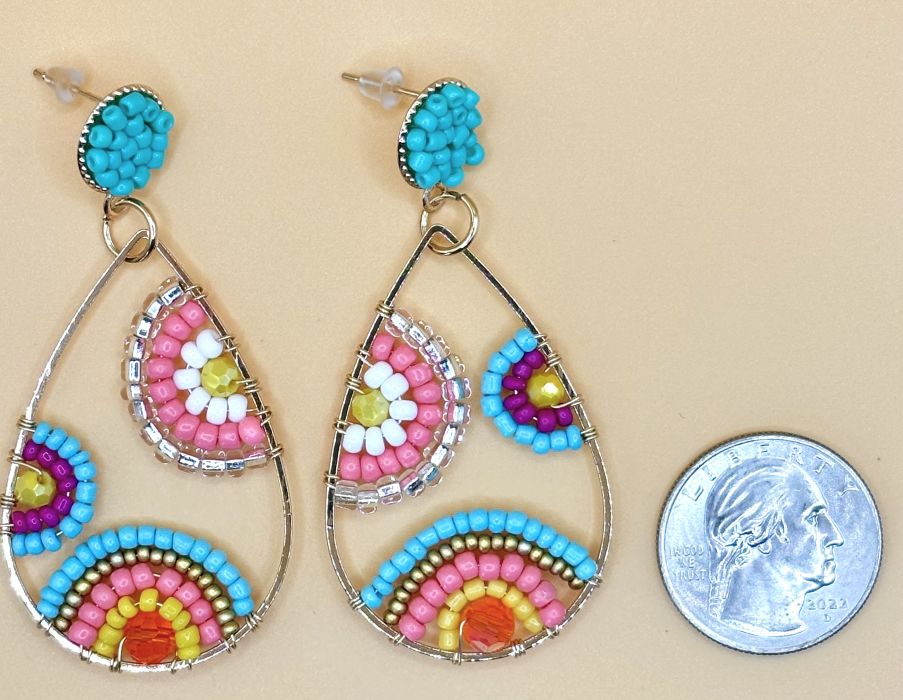 The colors of these beautifully handcrafted earrings make them perfect for spring into summer! These earrings are colorful, whimsical and unique. Post back is decorated with teal seed beads; this piece is approx. 1/2" diameter. From this hangs the teardrop-shaped body. Seed beads in colors of pink, sky blue, white, shiny silver, gold, yellow and magenta make fun designs. Gold tone zinc alloy. Exquisitely handcrafted.
