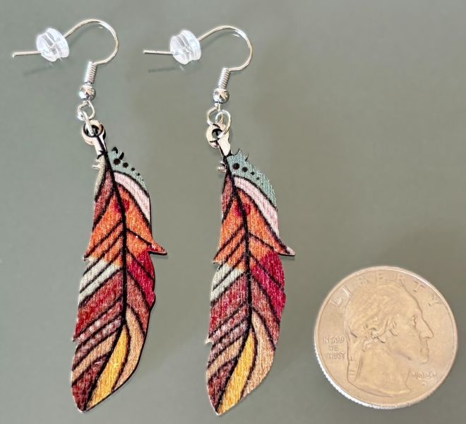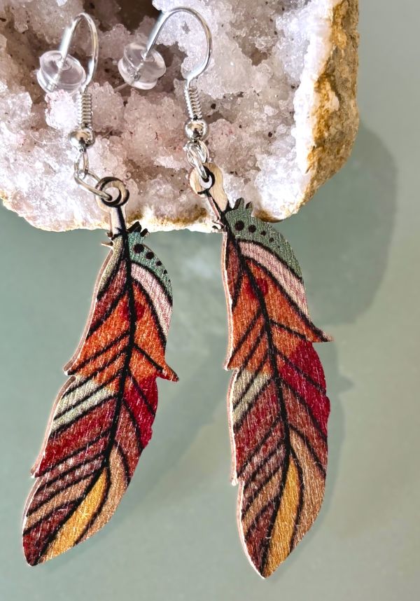 These unique wood earrings feature Bohemian multicolored feathers with the colorful design on both sides. The wood construction ensures that they are very lightweight and can be worn comfortably all day long - you'll probably forget you're wearing earrings altogether!