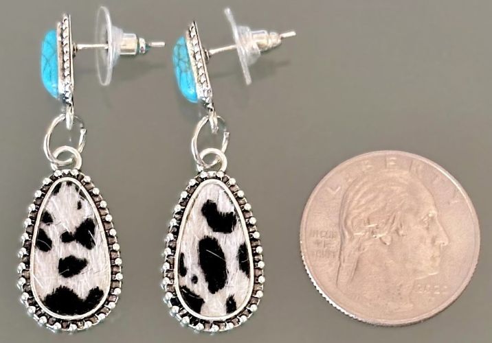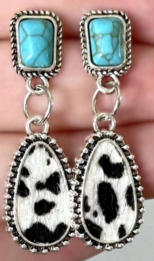 These earrings are so much fun! Post backs features a rectangular turquoise stone with great veining. From that piece hangs a teardrop shape featuring flocked black and white cow print - looks very similar to real cow hide. The metal around each piece is detailed which definitely elevates the charm of these earrings.