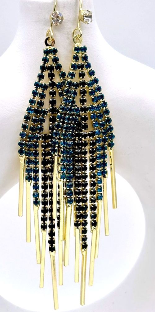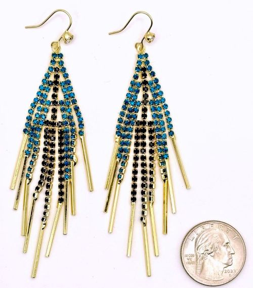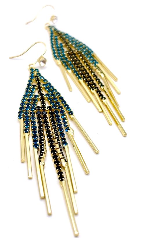 Introducing our sparkly tassel earrings featuring black and peacock blue rhinestones, the perfect accessory to elevate any outfit! These earrings are designed to make a statement of elegance. A single clear rhinestone shines at the top on the French wire. 14K gold plated alloy.