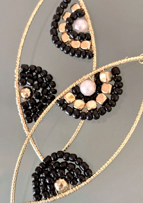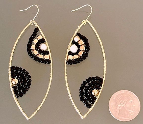 These hollow ellipse-shaped earrings feature two hand beaded half circles beaded with black glass beads, square gold beads and a round faux pearl. The beaded half circles measure approx. 1 1/8"L x 5/8"W. Elegant and delicate. 14k gold plated.