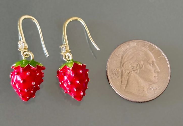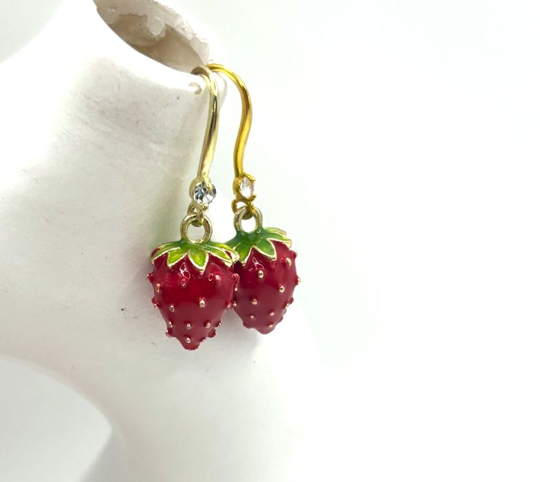 Discover the charm of our Fresh Summer Fruit collection with these delightful figural strawberry drop earrings. Crafted in 3D, each strawberry showcases detailed raised seeds, green leafy tops, and sparkling rhinestone highlights. The vivid red enamel brings these berries to life, set on a gold-tone zinc alloy base that feels substantial yet comfortable. Though petite, these earrings make a bold, charming statement perfect for adding a fresh pop of color to any summer outfit.