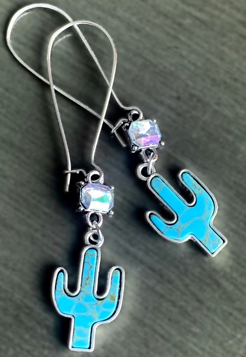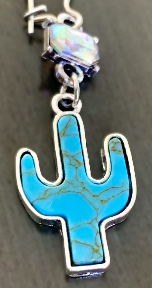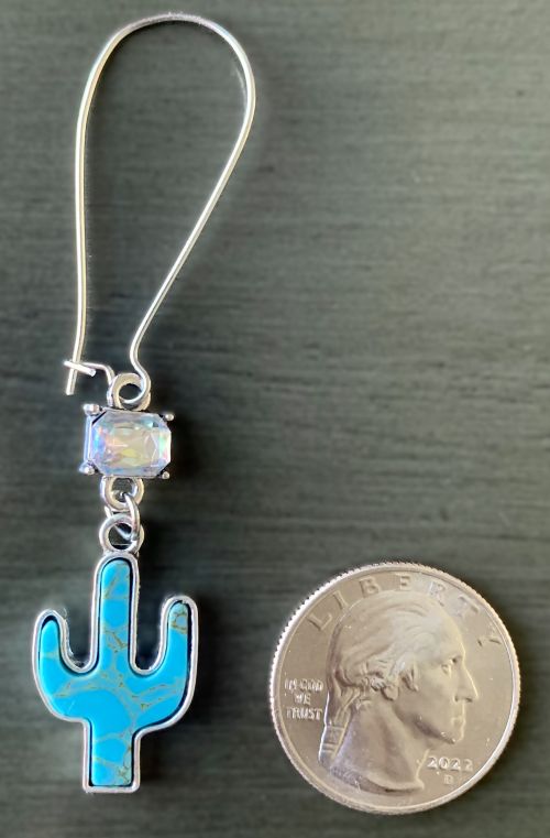 Upgrade your accessory game with these statement earrings. Handcrafted with genuine turquoise stone and an iridescent rhinestone, these earrings add a fun and sparkly touch to any outfit. The vibrant veining of the turquoise enhances the overall appeal, while the shiny silver plated alloy provides durability and a sleek finish. Plus, with lightweight and comfortable ear wires, you can wear these earrings all day without any discomfort. Opt for these unique cactus-shaped earrings for a touch of nature-inspired elegance in your jewelry collection.