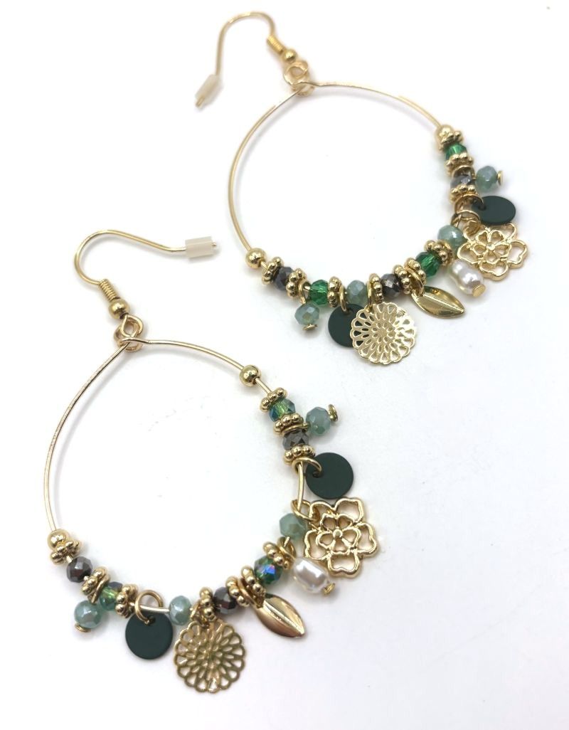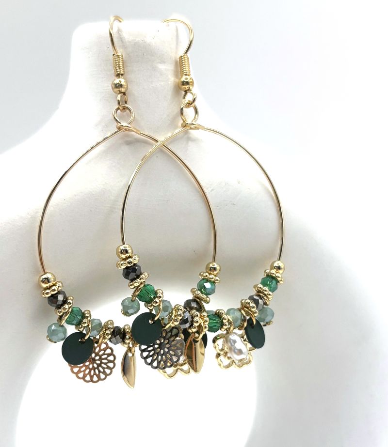 These lightweight golden hoops combine elegance with versatile charm, making them perfect for both everyday wear and special occasions. Crafted from gold-plated copper wire, their oblong shape beautifully frames a curated mix of dangling elements.