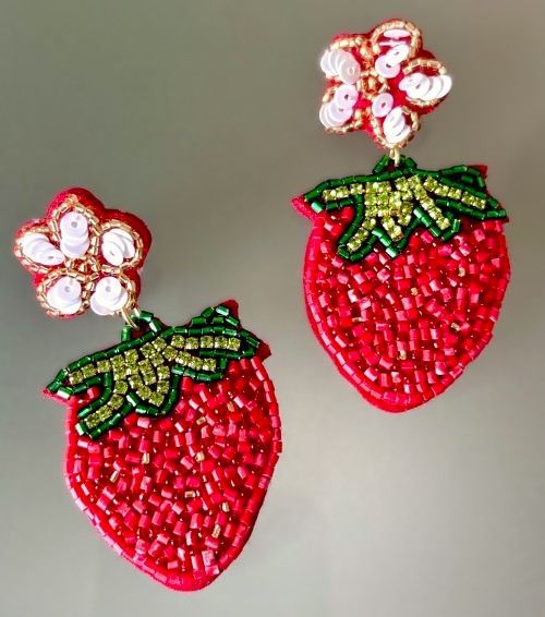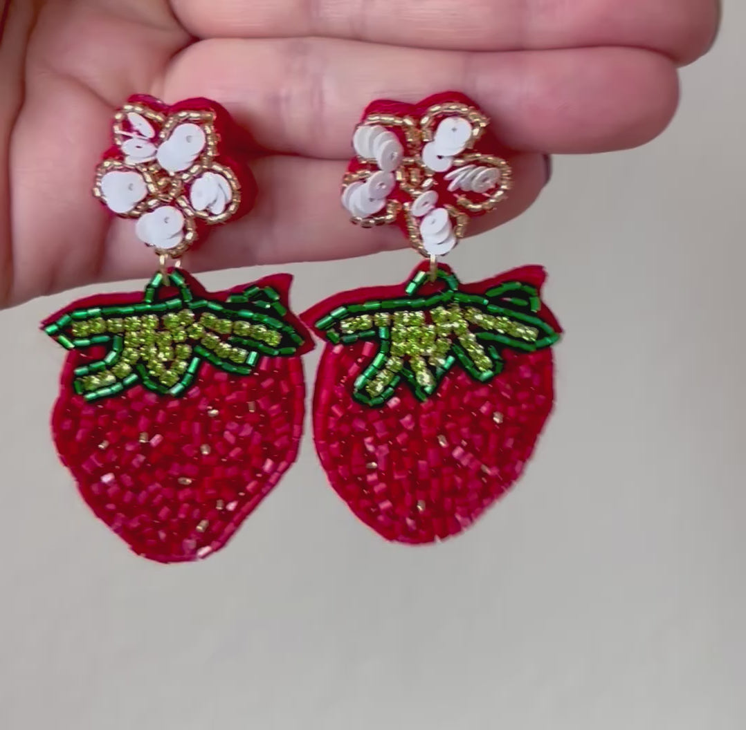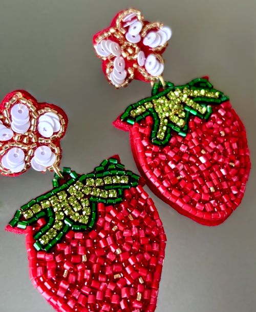 From our Fresh Summer Fruit collection, come these hand beaded strawberry earrings. Freshly picked from the strawberry vine, they have a post back that is decorated as a pretty white strawberry flower. The flower shape is decorated with metallic gold seed beads and white sequins which are stitched on. The body of the strawberry is beaded with red cylinder beads and a few metallic gold and red seed beads mixed in for sparkle. The green leafy head has shiny green seed beads and light lime green rhinestones. No detail has been overlooked!