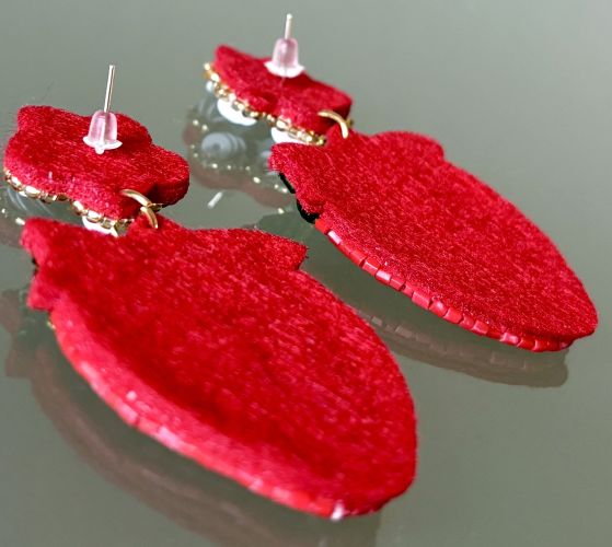With a thick red felt foundation, these earrings are so light you'll forget you're wearing them. With shiny green seed beads, white sequins and lime green rhinestones these super cute earrings will sparkle and shine in the sunlight.