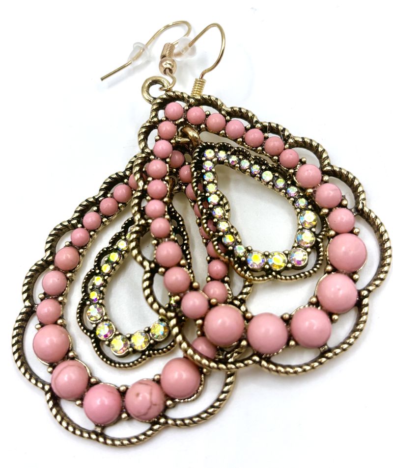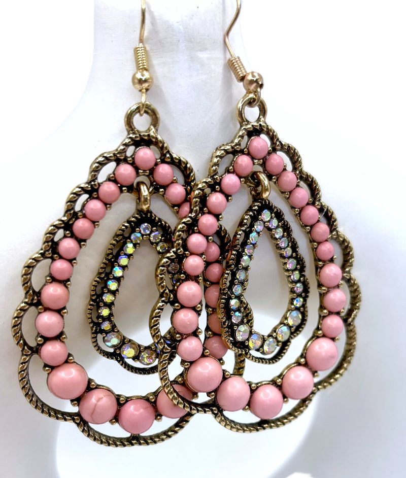 Pink Turquoise Iridescent Rhinestone Scalloped Double Teardrop Earrings