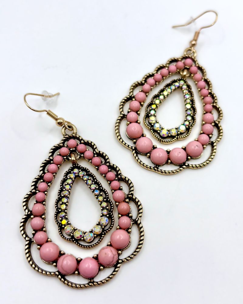 Make a statement with these captivating double teardrop earrings that blend elegance with playful movement. The scalloped outer teardrop frames a shimmering iridescent rhinestone inner drop that sways freely, creating dynamic sparkle with every turn of your head. Adorned with soft pink turquoise accents and crafted from gold-tone zinc alloy, these earrings deliver sophisticated style with an undeniable wow factor. Perfect for anyone seeking jewelry that's both refined and unforgettable.