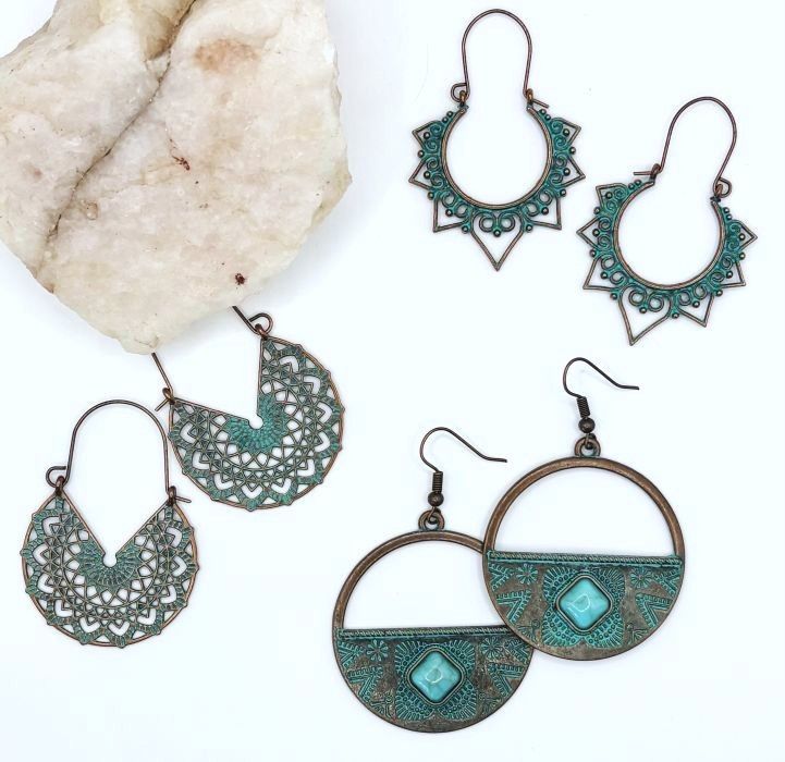All three pairs are lightweight copper tone zinc alloy with a pretty turquoise "patina" finish.