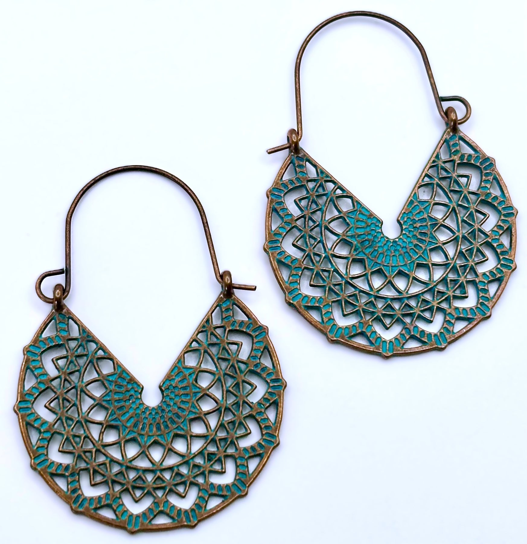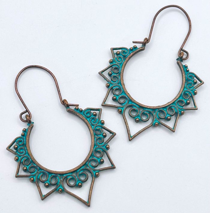 This trio of earrings captures the charm of copper patina with a Southwestern flair. The first pair features circular hoops with a pie-cut and ethnic filigree; they have secure lever back closures and measure approx. 1 7/8" by 1 3/8".