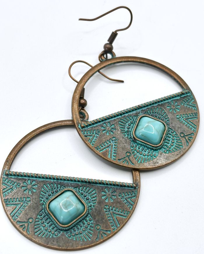 The second pair dangles gracefully with etched Southwestern designs and a distinctive square faux turquoise bead, hanging from French wires at approximately 2 1/4" long and 1 1/2" wide.