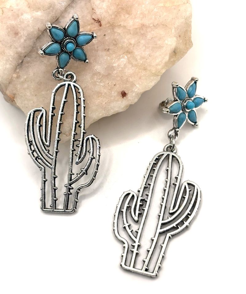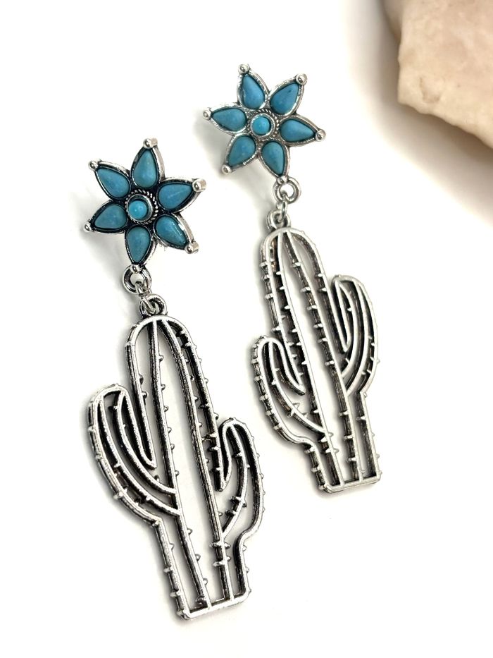 Add a touch of Southwestern whimsy to your outfit with these outlines of silver cacti with faux turquoise beaded flower post backs. The beaded flowers measure approx. 5/8" diameter. These casual earrings pack a lot of charm and would look great with your favorite denim!
