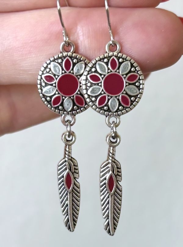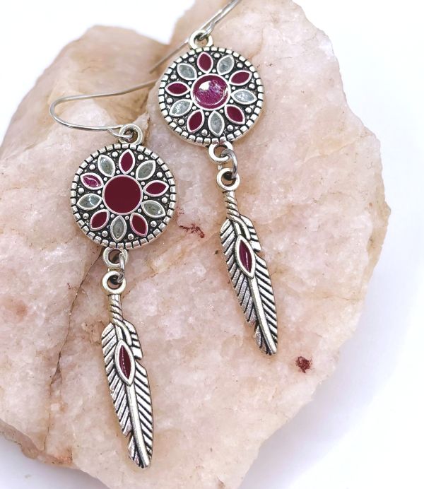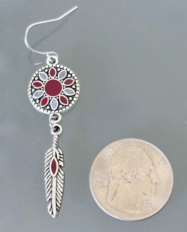 Embrace the spirit of the Southwest with these captivating earrings. Featuring dreamcatcher-style circular tops (5/8" diameter) adorned with burgundy and light gray enamel details, each piece dangles an elegant feather charm below. The antiqued silver finish completes this perfect accessory for those seeking Native American-influenced style with contemporary appeal.