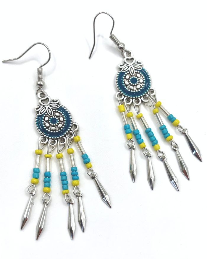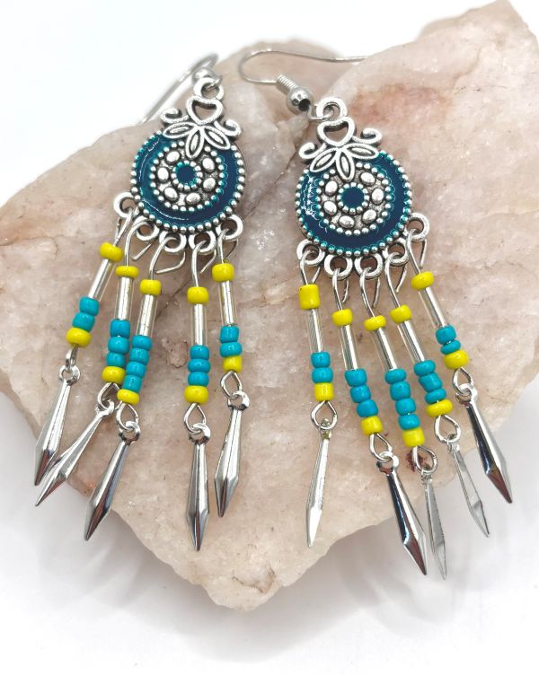Embrace southwestern charm with these exquisite tasseled earrings that pack a color 'pop'. Seven meticulously hand-beaded tassels cascade from a beautiful deep teal enameled body, combining turquoise and vibrant greenish-yellow seed beads that culminate in striking dagger-shaped charms. These delicate earrings offer the perfect touch of southwestern charm for jewelry enthusiasts seeking distinctive style.