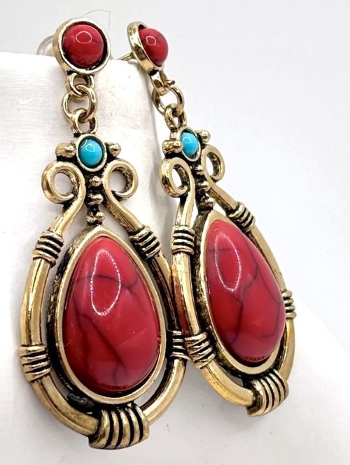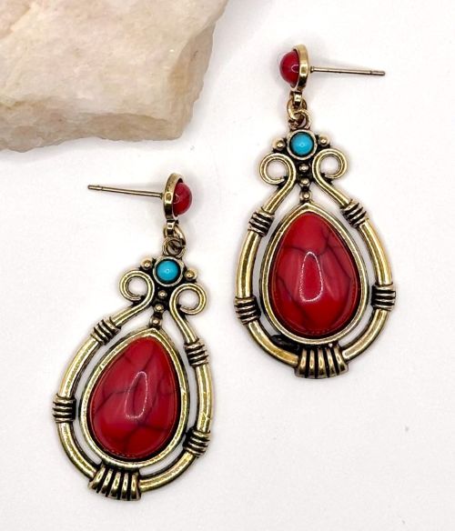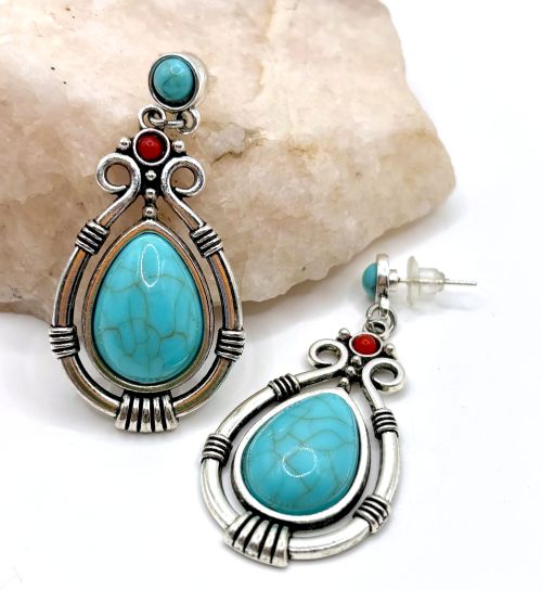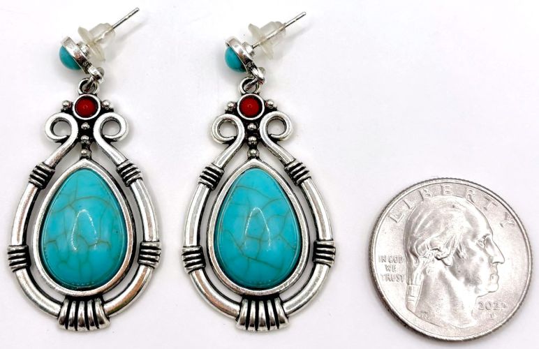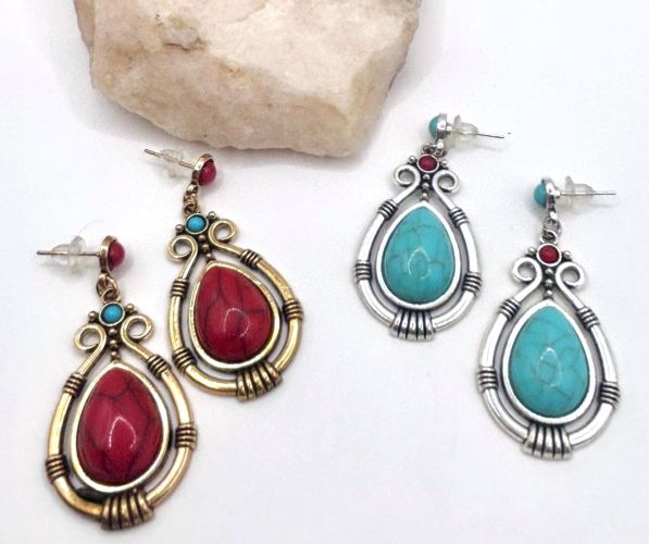 These earrings have elegant Southwestern flair with their faux turquoise beads in an ornate teardrop setting. The faux turquoise beads have a quality, realistic appearance. These earrings are available in blue turquoise with an antiqued silver finish or red turquoise with an antiqued gold finish. Both styles are accented with smaller beads of the opposite color decorating the top of the teardrop setting and the post backing.