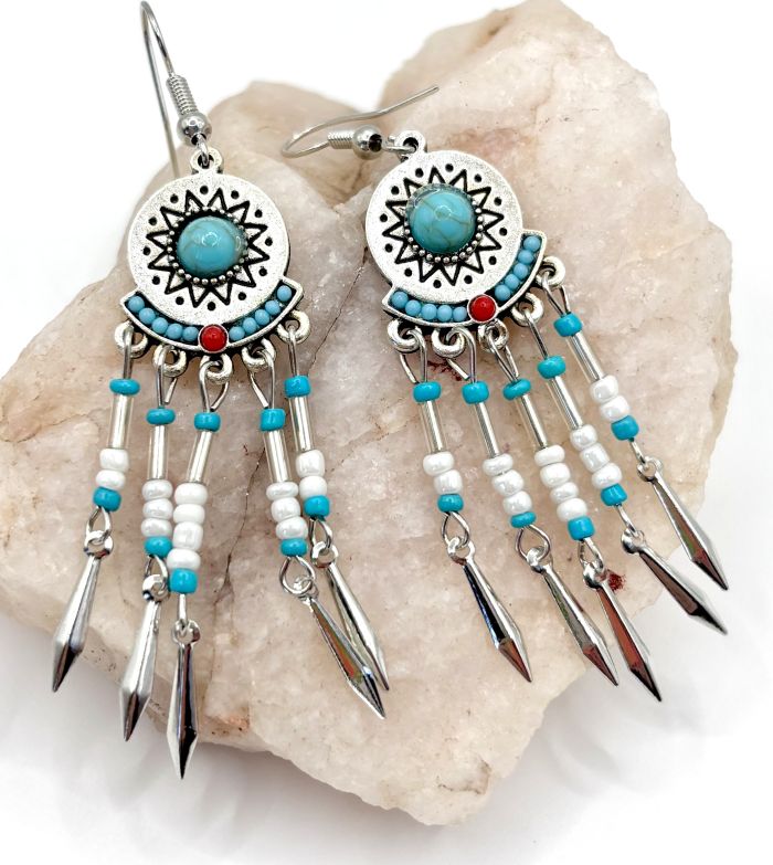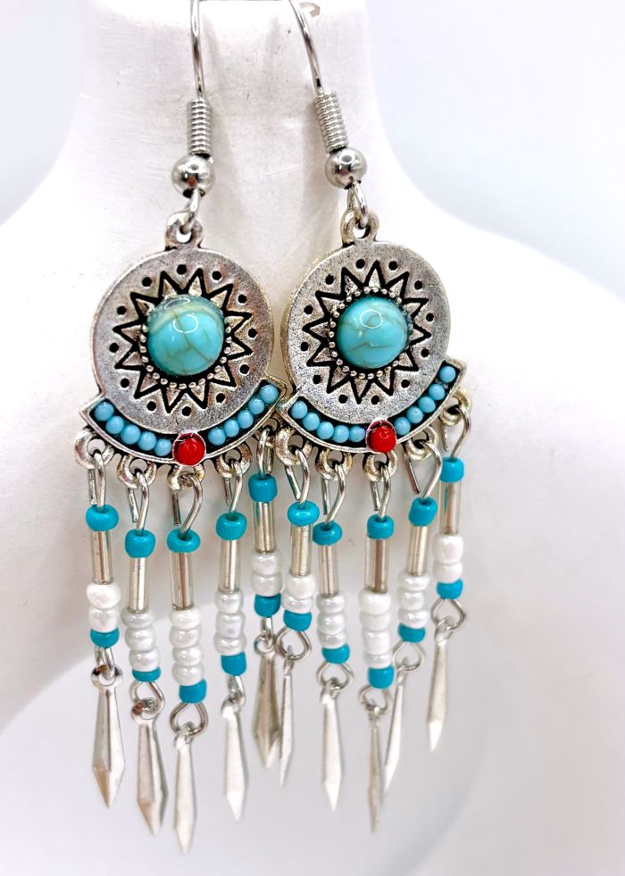 A delicate row of turquoise seed beads highlights a central red bead, while five graceful tassels adorned with turquoise and pearly white beads create beautiful movement. Silver alloy dagger charms add a captivating finishing touch to these eye-catching earrings.