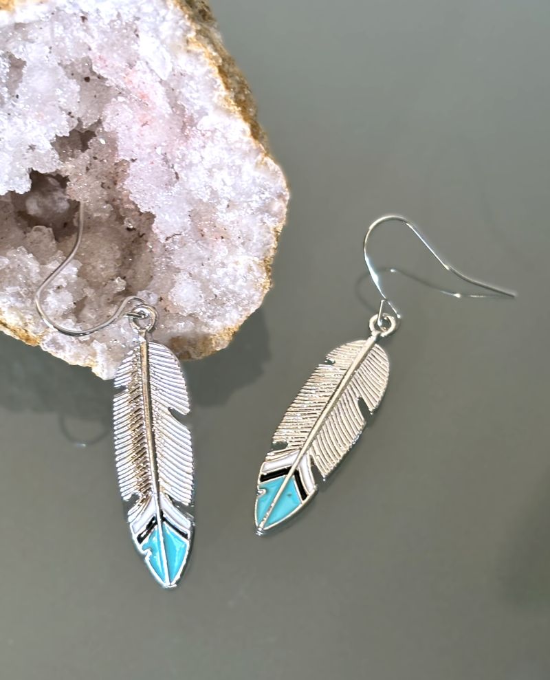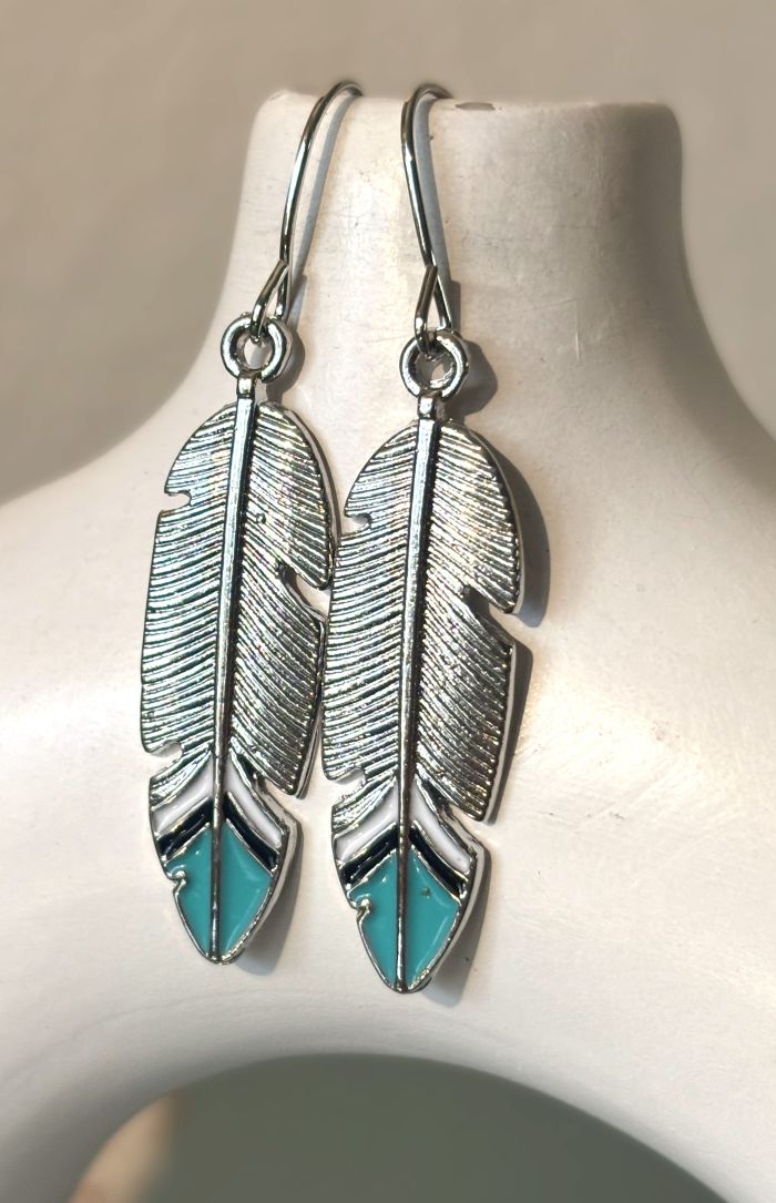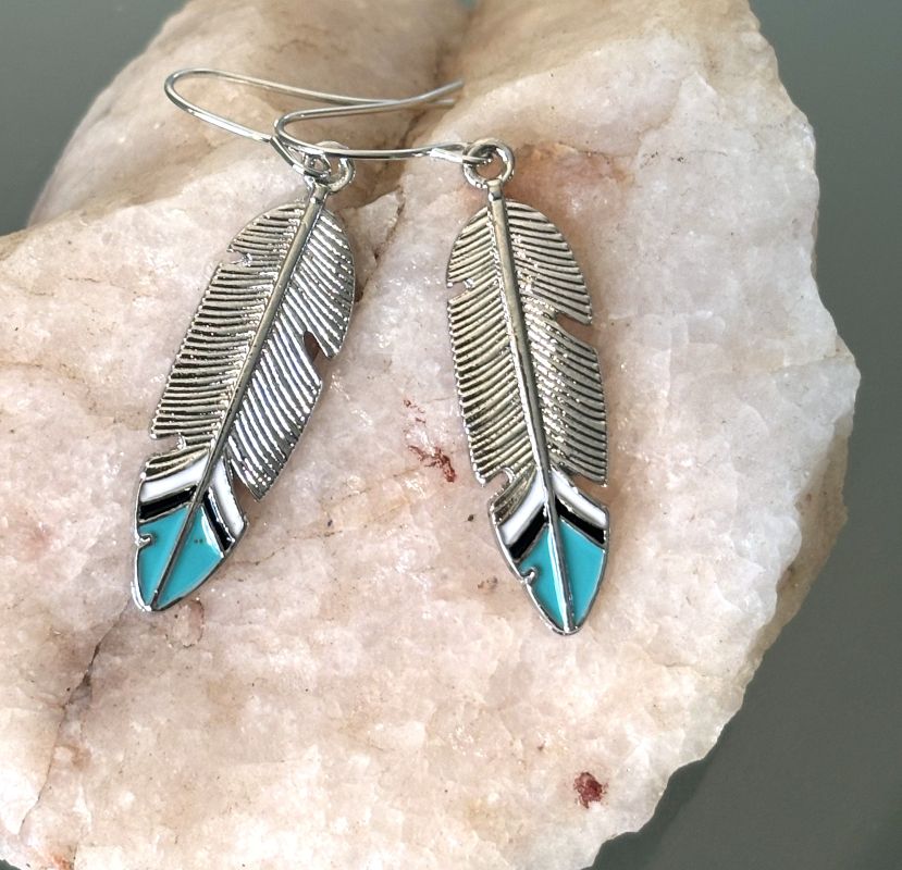 Discover the perfect blend of artistry and elegance with these striking feather earrings inspired by Southwestern aesthetics. Crafted with silver plating and finished with hand-enameled tips in crisp white, bold black, and vibrant turquoise, each pair showcases meticulous attention to detail. The carefully chosen color palette adds depth and visual interest that draws the eye.
