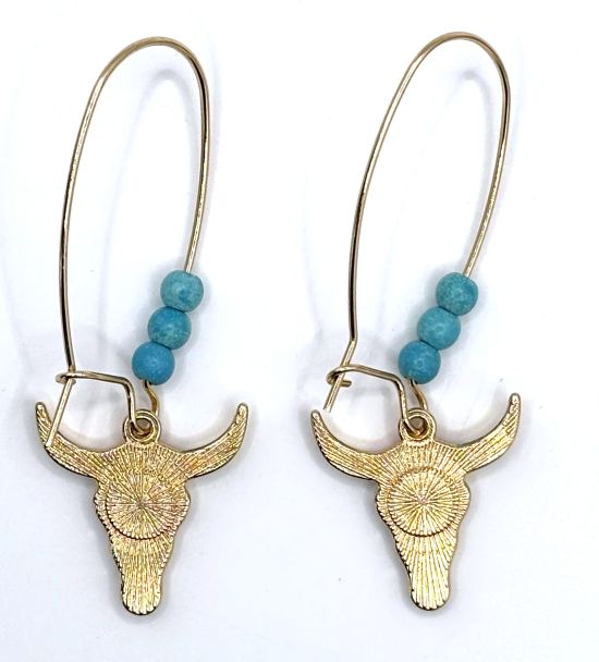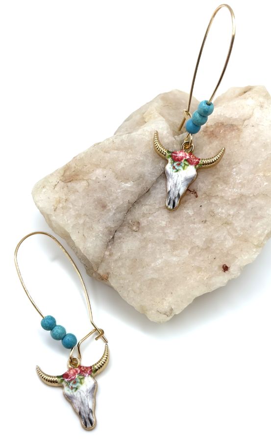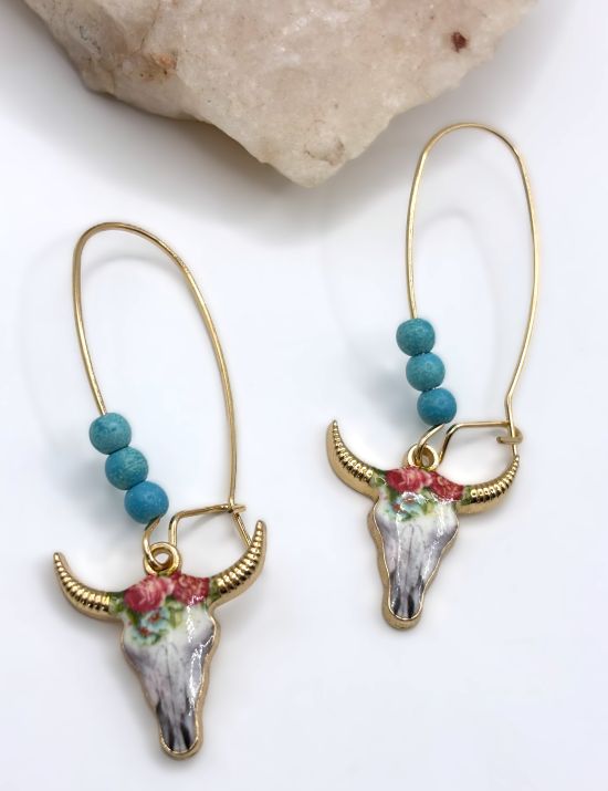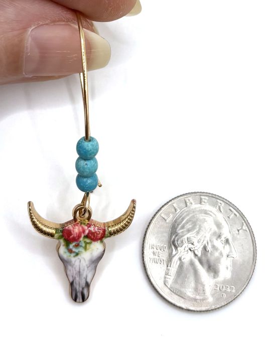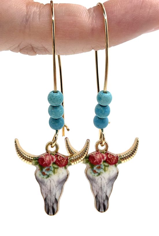 Celebrate your Western spirit with these charming drop earrings. Featuring cattle skulls adorned with vivid pink floral rose designs, they perfectly capture a bold cowgirl vibe. Accented by three turquoise blue beads on each ear wire, these earrings add a unique pop of color to your look.