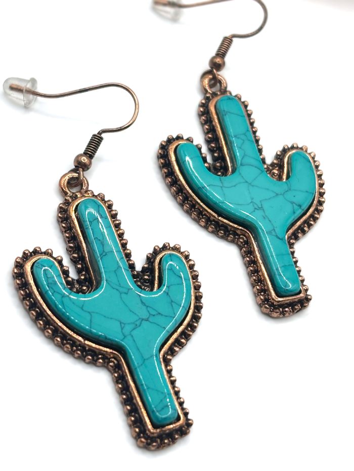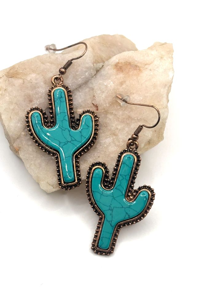 With a sleek beaded copper tone metal setting, these cactus earrings add a touch of charm to any outfit. Cute Saguaro cactus shapes! The vibrant turquoise color with veining adds a pop of color, while the acrylic material creates the look of ceramic without the fragility or weight.