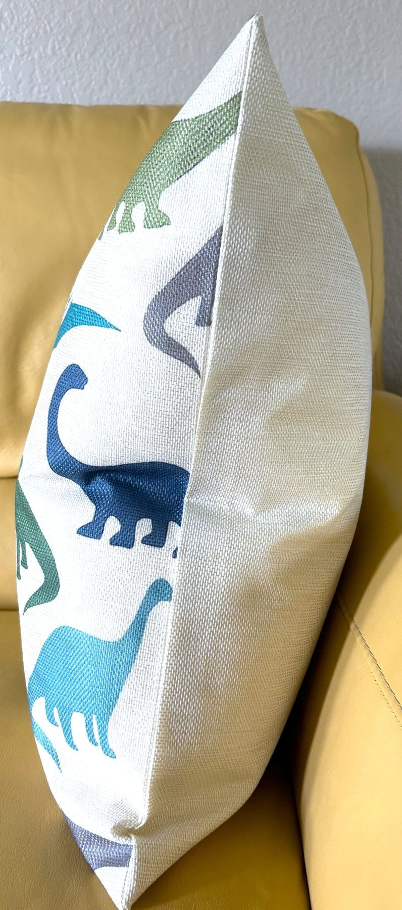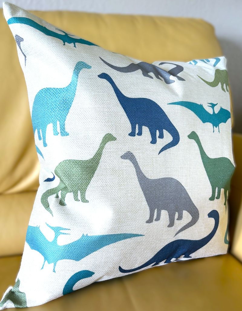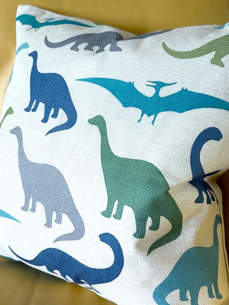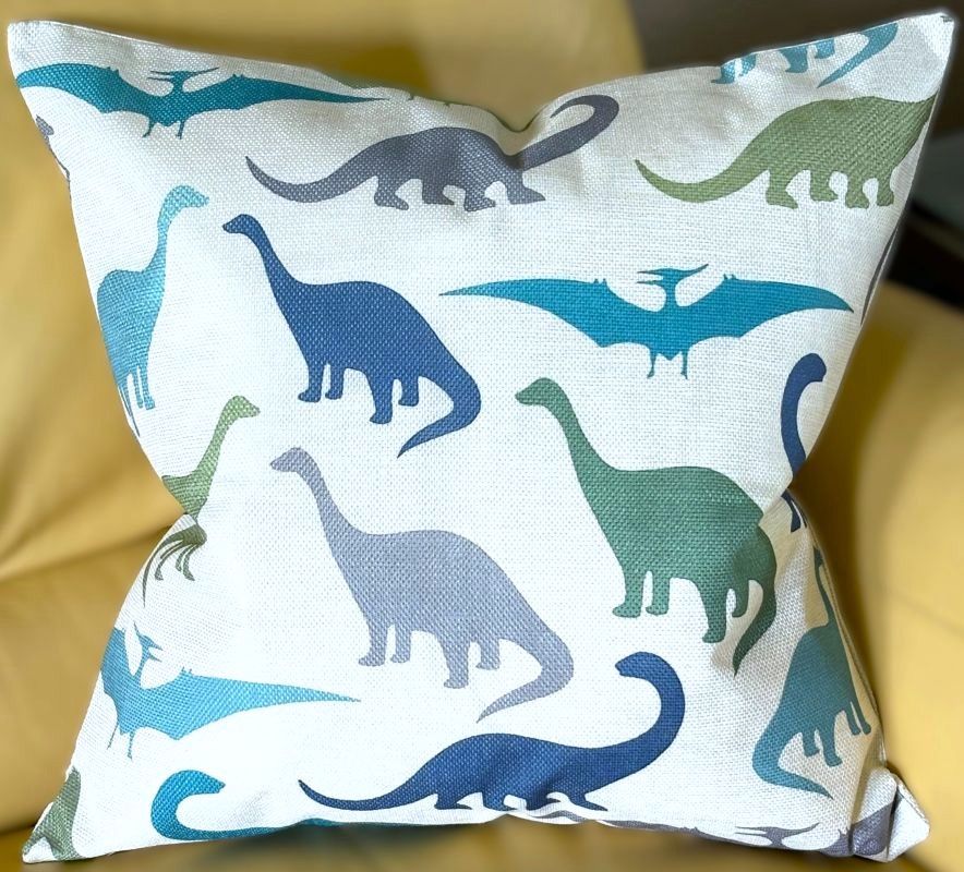Bring prehistoric charm to your child's room with this delightful 20x20 pillow cover. Vibrant dinosaur silhouettes pop against a warm, natural linen backdrop in a carefully curated mix of teal, dark gray, rich blue, and soft avocado green. An ideal accent piece that sparks imagination while adding cozy style to bedrooms, playrooms, or reading corners.