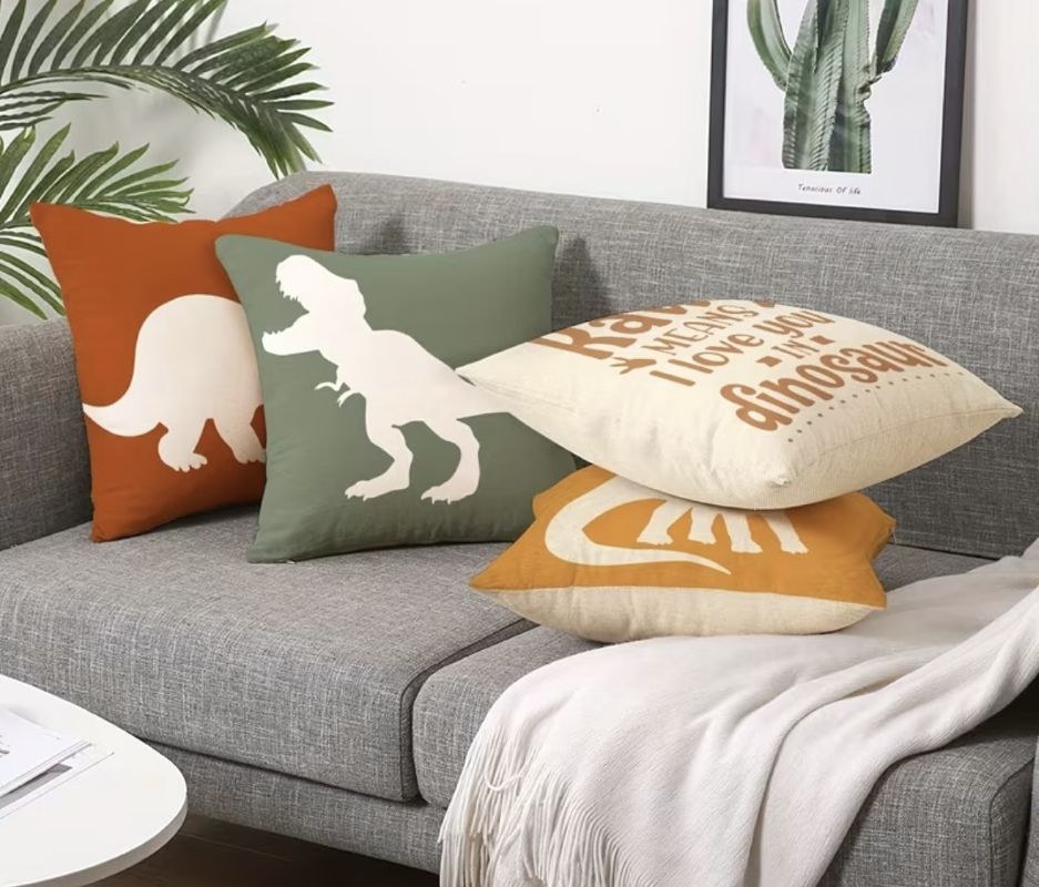 Transform your child's space into a prehistoric paradise with this charming four-piece pillow cover collection. Each 18"x18" cover celebrates dinosaur enthusiasm through iconic designs—featuring a mighty T-Rex, graceful Brontosaurus, and formidable Triceratops alongside a playful "Rawr means I love you in dinosaur" message. The warm, earthy palette complements any room décor while sparking imagination and joy.