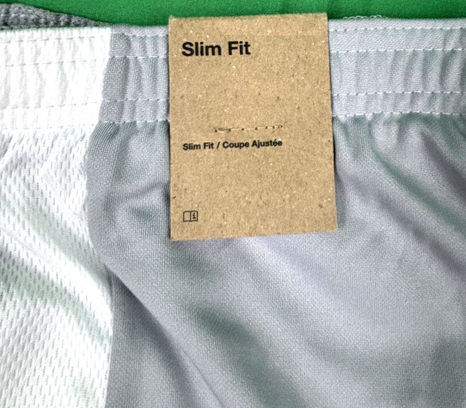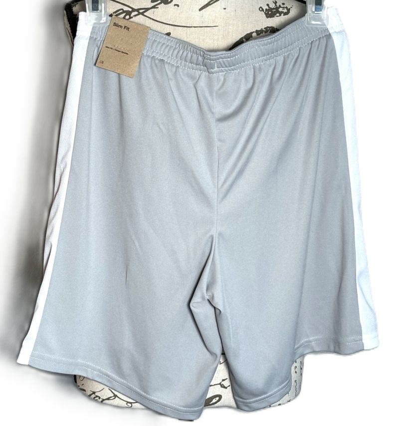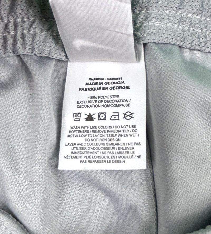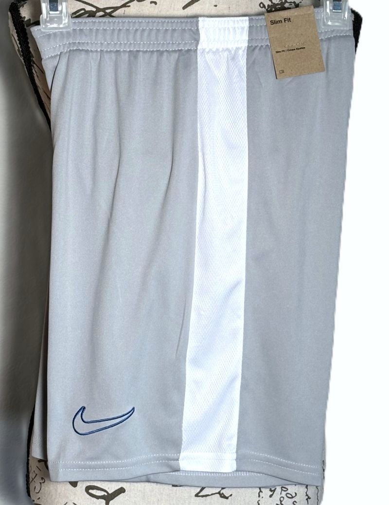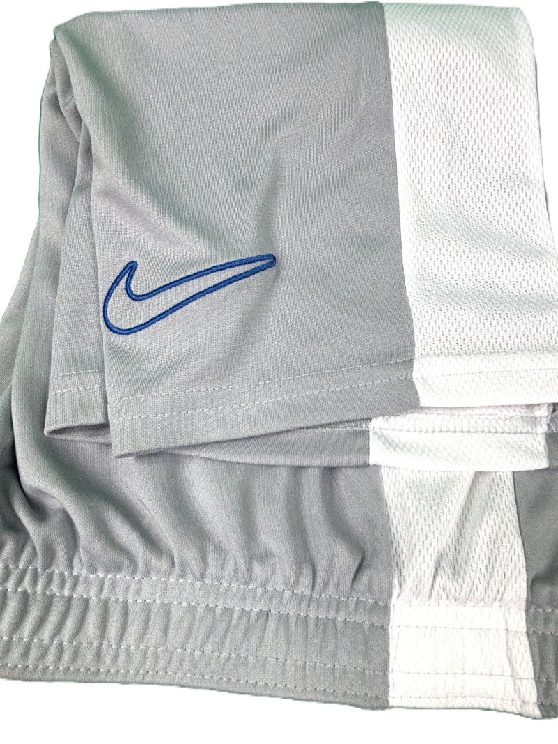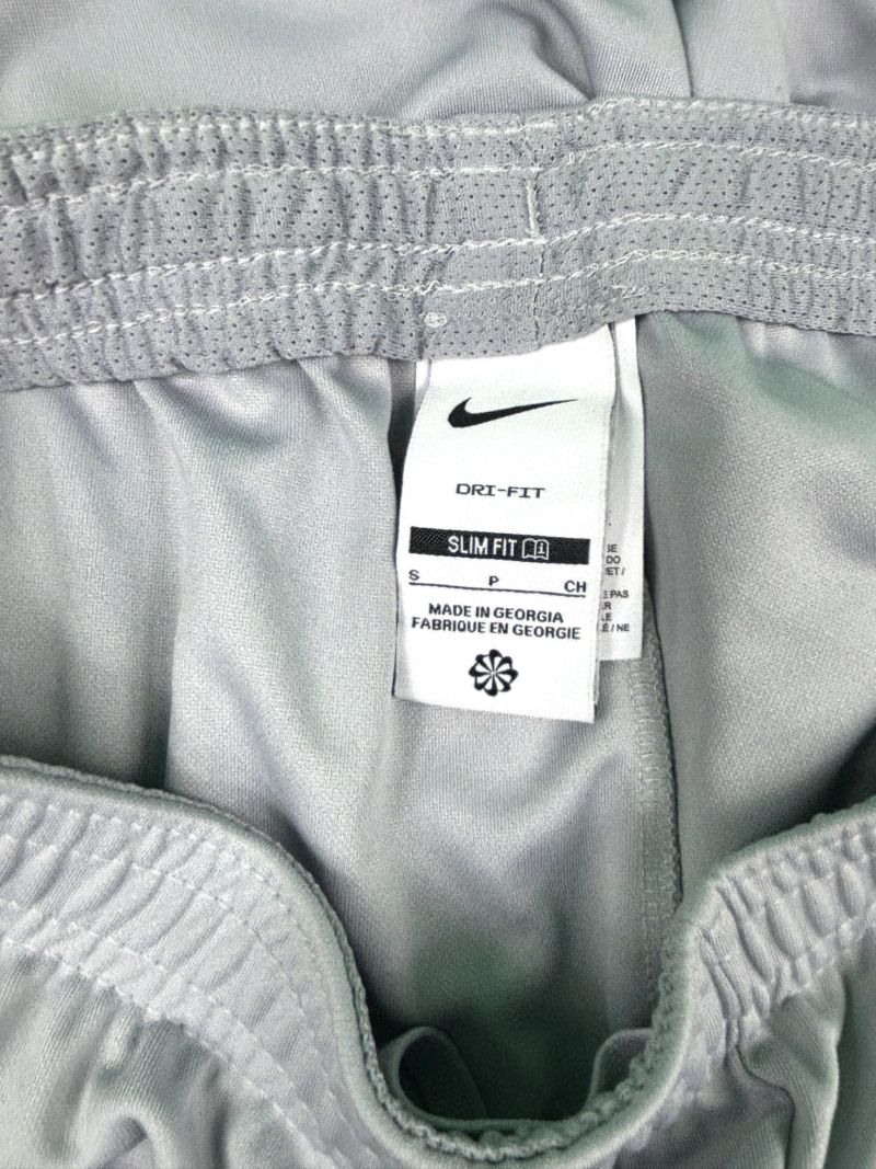 Elevate your game with these Nike basketball shorts, engineered for the modern athlete. The slim-fit silhouette delivers a streamlined look that moves with you, while the light gray and white colorway keeps your style sharp on and off the court. Featuring Nike's iconic blue embroidered swoosh and a secure elasticized waistband with adjustable drawstring, these shorts combine comfort with performance. Perfect for training, pickup games, or casual wear. Size small.