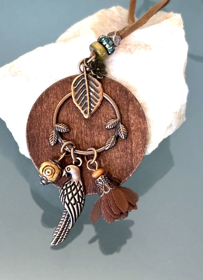 Elevate your everyday style with this captivating pendant necklace, where four delicate charms—including an enchanting bird and leaf design—dance gracefully with your movement. The warm burnished copper tones and organic textures evoke natural beauty, while the thoughtful interplay of metallic accents adds sophisticated dimension. Slip it on via the soft suede cord and experience effortless bohemian elegance that transitions seamlessly from day to night.