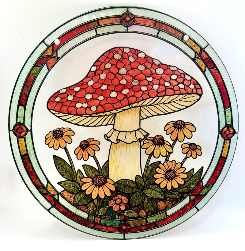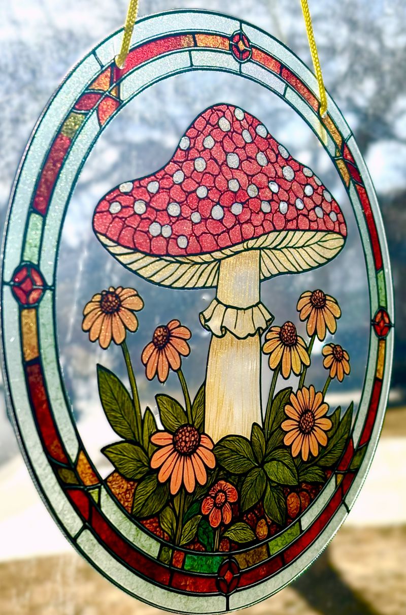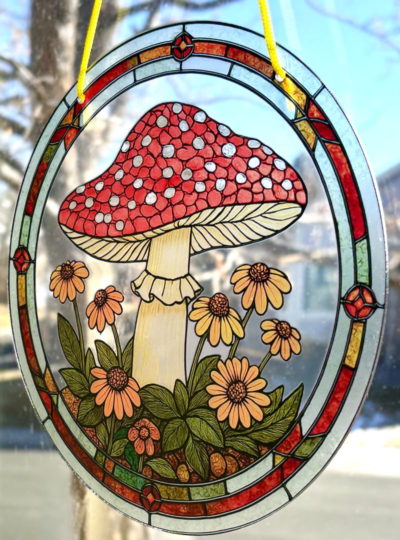 Brighten any room with this enchanting sun catcher, featuring a striking red spotted toadstool nestled among cheerful yellow daisies. The whimsical design captures sunlight beautifully, casting warm, magical shadows that transform your space into a garden sanctuary. Perfect for windows, patios, or anywhere you want to add a touch of nature-inspired charm and springtime joy.