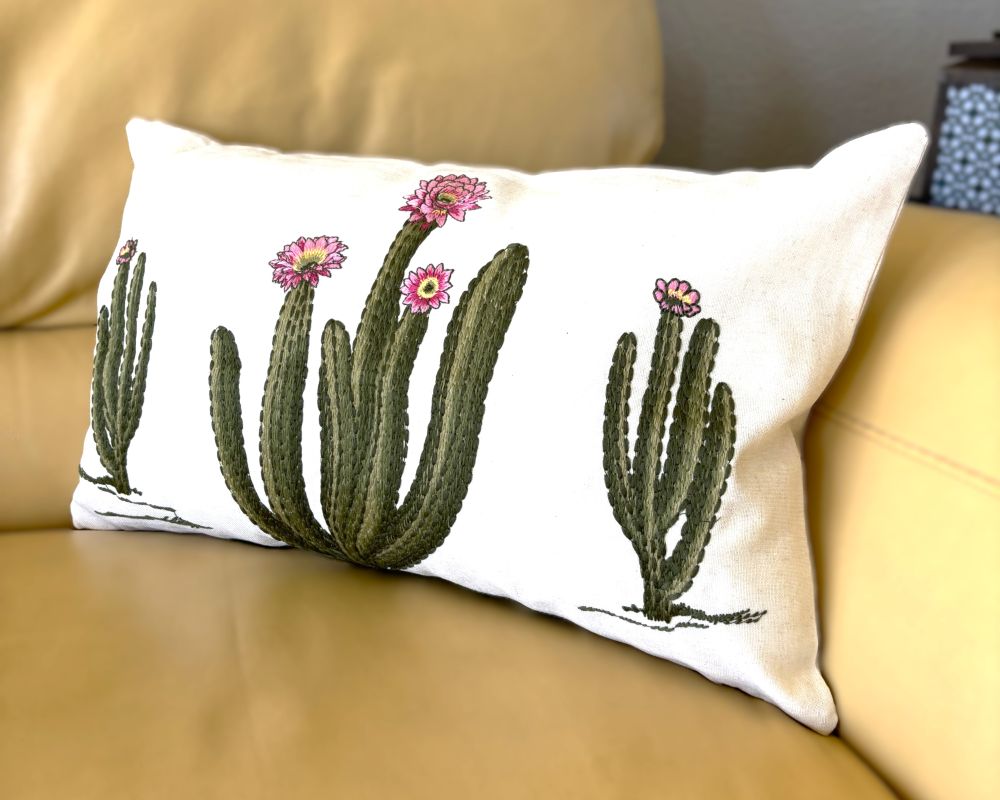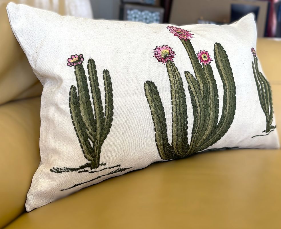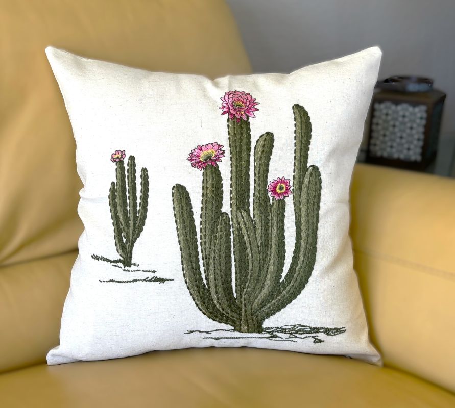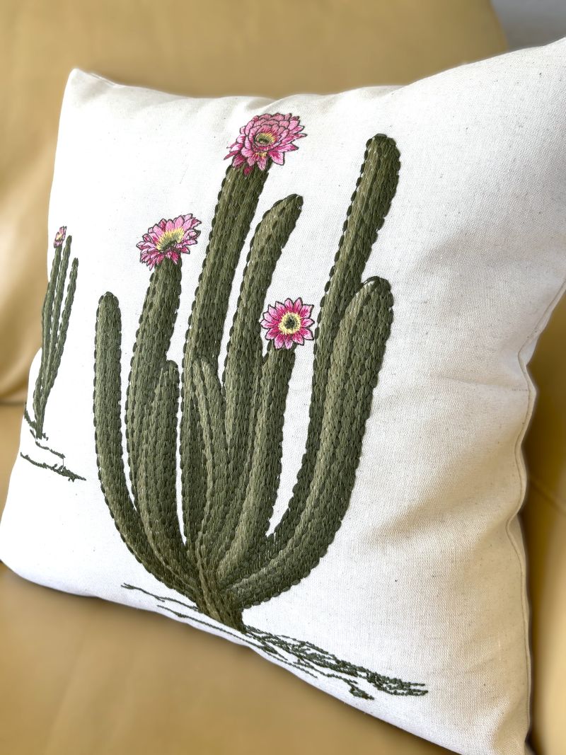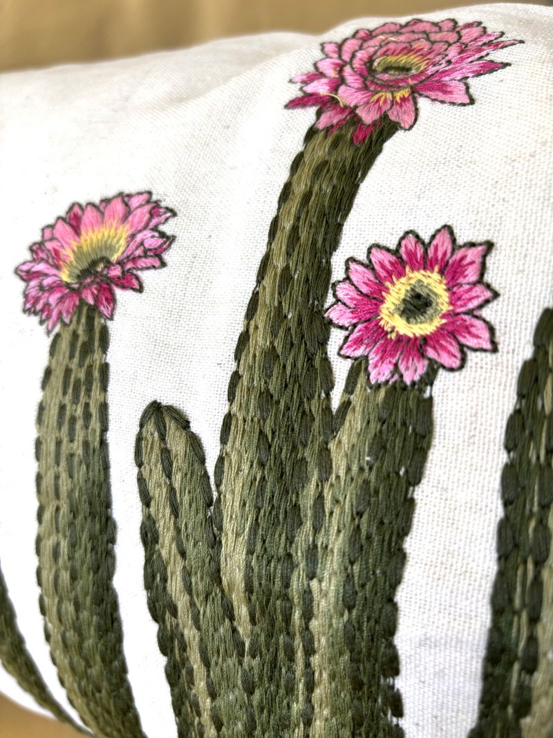 Elevate your space with this stunning throw pillow cover showcasing intricately embroidered flowering cacti in eye-catching pink hues. Crafted from a linen-blend fabric, each piece boasts a naturally textured, organic appearance that adds warmth and character to any room. The subtle variations in the background create an artisanal quality that transforms your décor into a gallery-worthy display. Available in two sizes - 18" x 18" and 12" x 20".