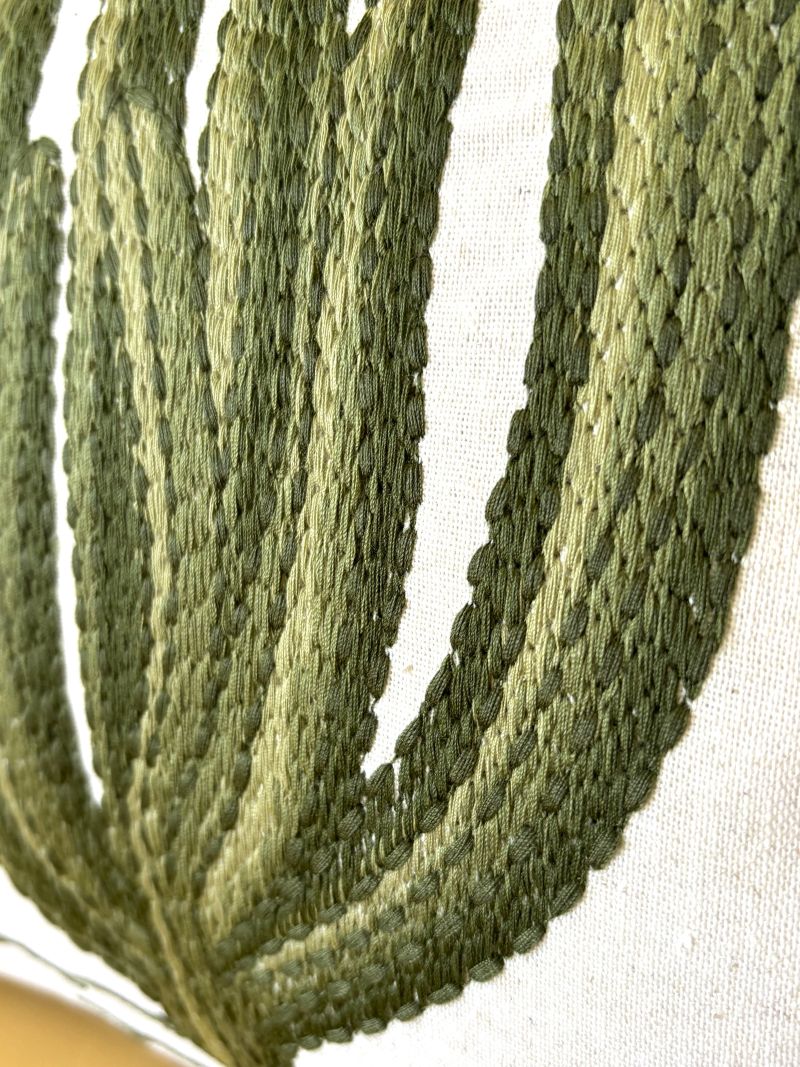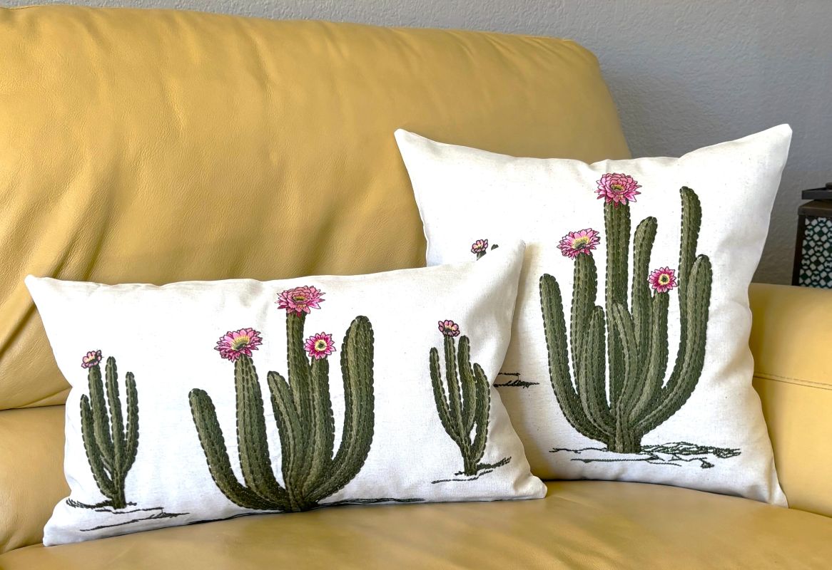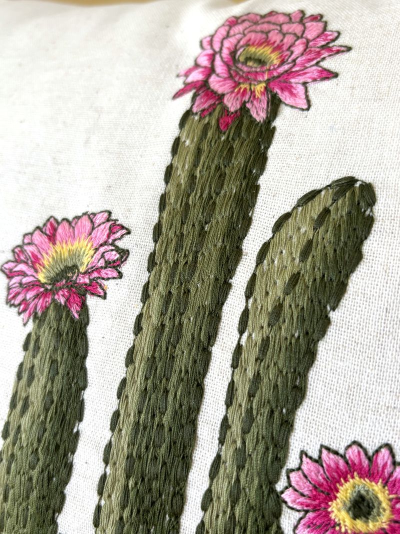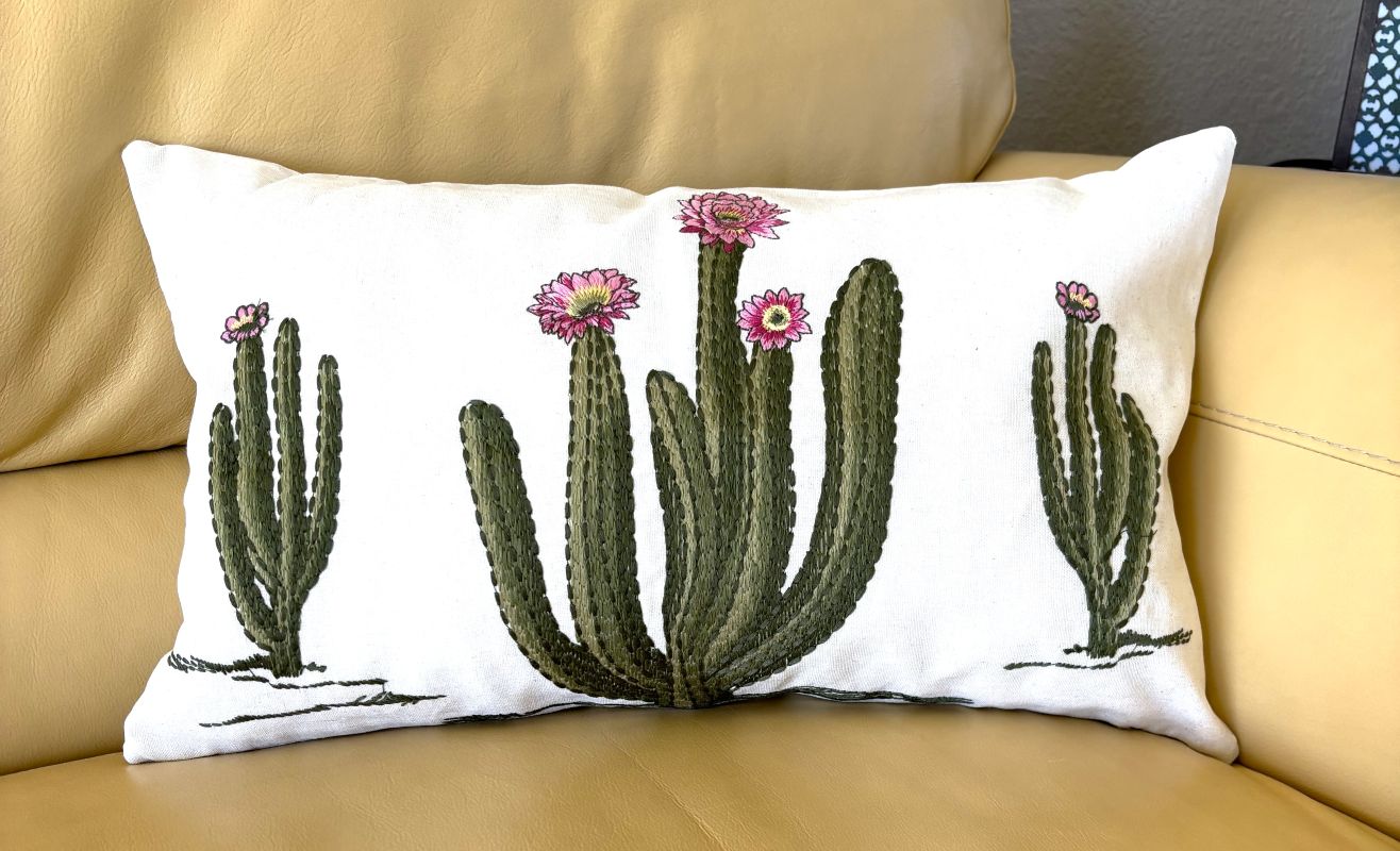 Elevate your space with this stunning throw pillow cover showcasing intricately embroidered flowering cacti in eye-catching pink hues. Crafted from a linen-blend fabric, each piece boasts a naturally textured, organic appearance that adds warmth and character to any room. The subtle variations in the background create an artisanal quality that transforms your décor into a gallery-worthy display. Available in two sizes - 18" x 18" and 12" x 20".