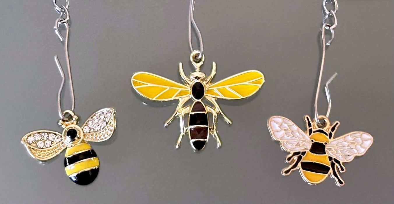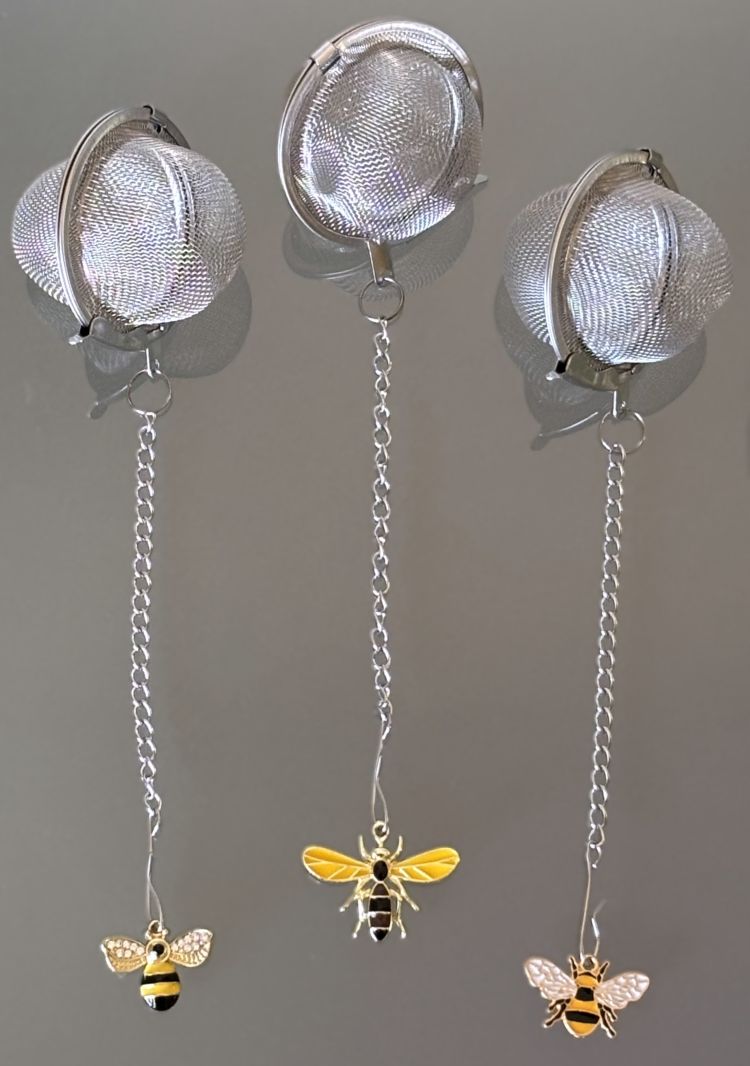Three distinct bee charms in colorful alloy and enamel dangle from the chains, with the smallest sparkling with rhinestone accents. The largest charm spans roughly 1"L x 1¼"W, making these infusers as visually appealing as they are functional. Perfect for tea lovers who appreciate both quality and whimsy.
