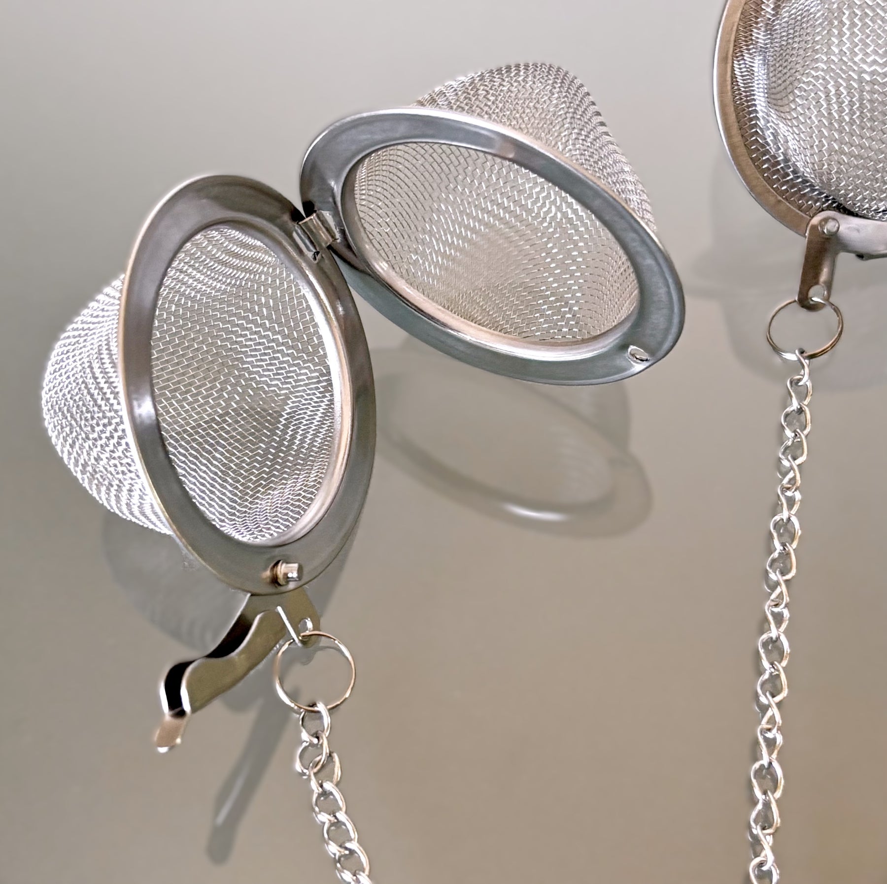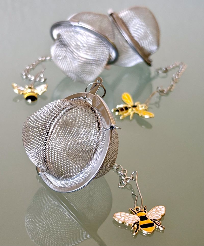 Brew the perfect cup with this delightful trio of stainless steel mesh infusers, each topped with a vibrant bee charm that adds personality to your tea ritual. The secure locking mechanism ensures loose leaves stay contained where they belong—in the infuser, not floating in your cup. Each spherical infuser measures approximately 2" x 2", offering ample space for your favorite blends. The chain measures approx. 6 1/2" long.
