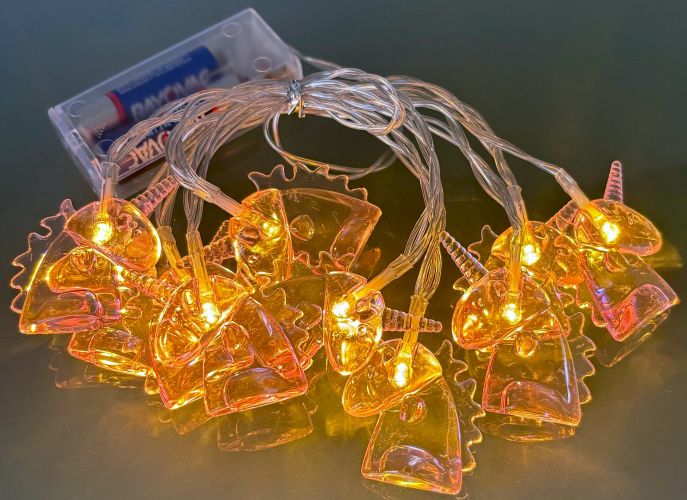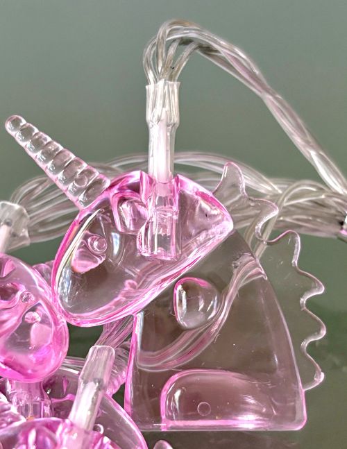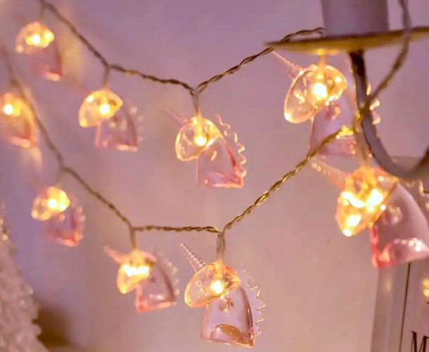 Add these magical unicorn string lights to your child's room and the 'cozy' factor will certainly go up with the warm pink glow these lights give off. Wrap them around a lamp or bed and use them as a calming night light. These are very cute string lights featuring 10 unicorn heads. The lights are made of hard plastic that is a translucent pink. Each unicorn head measures approx. 1 3/4"L x 1 3/4"W x 3/8" deep. Very cute design, great quality!