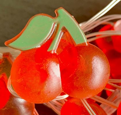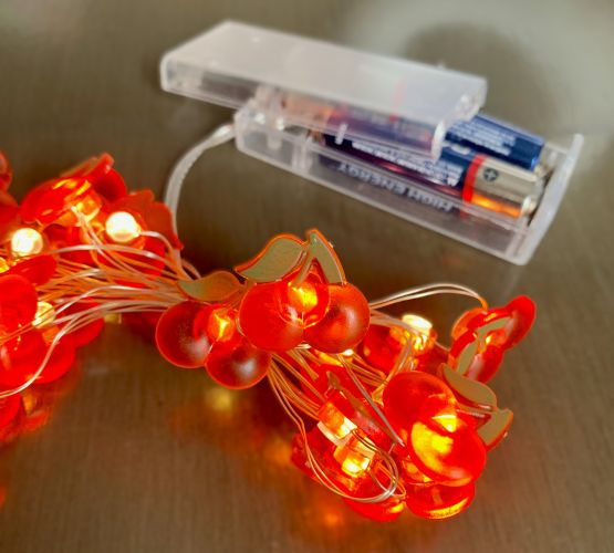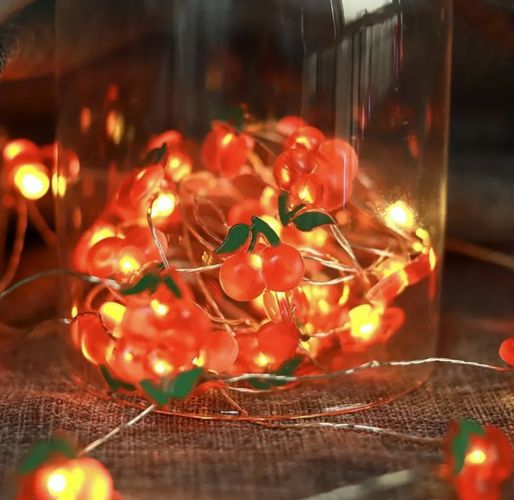 Illuminate your space with a touch of whimsy using these fun fairy lights which feature little pairs of cherries. These delightful LED lights are perfect for adding a playful vibe to any room, whether you're decorating your kitchen, creating a cozy atmosphere, or simply looking to brighten up a room.