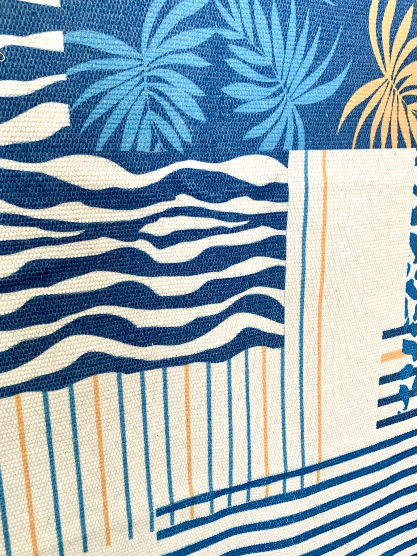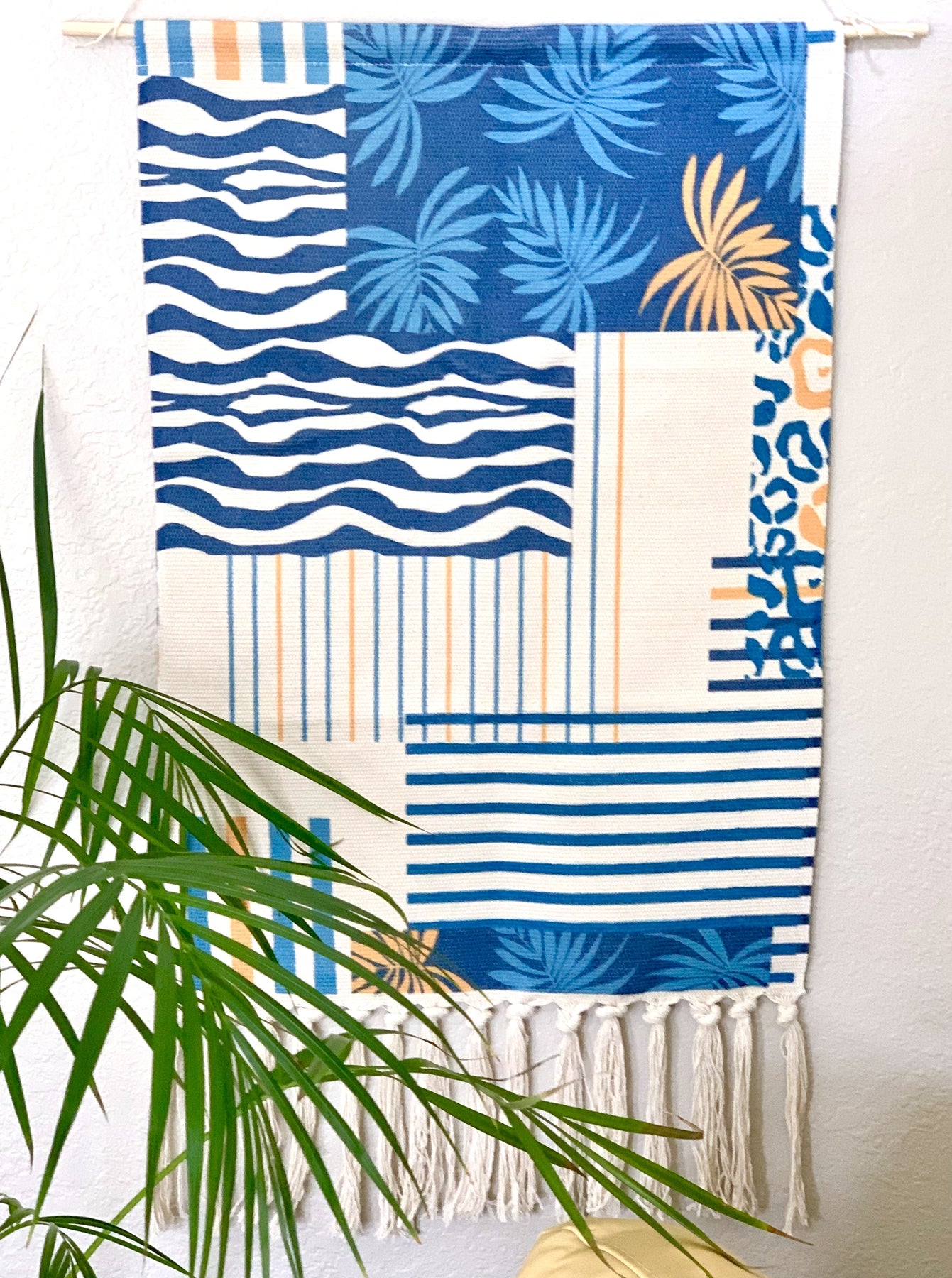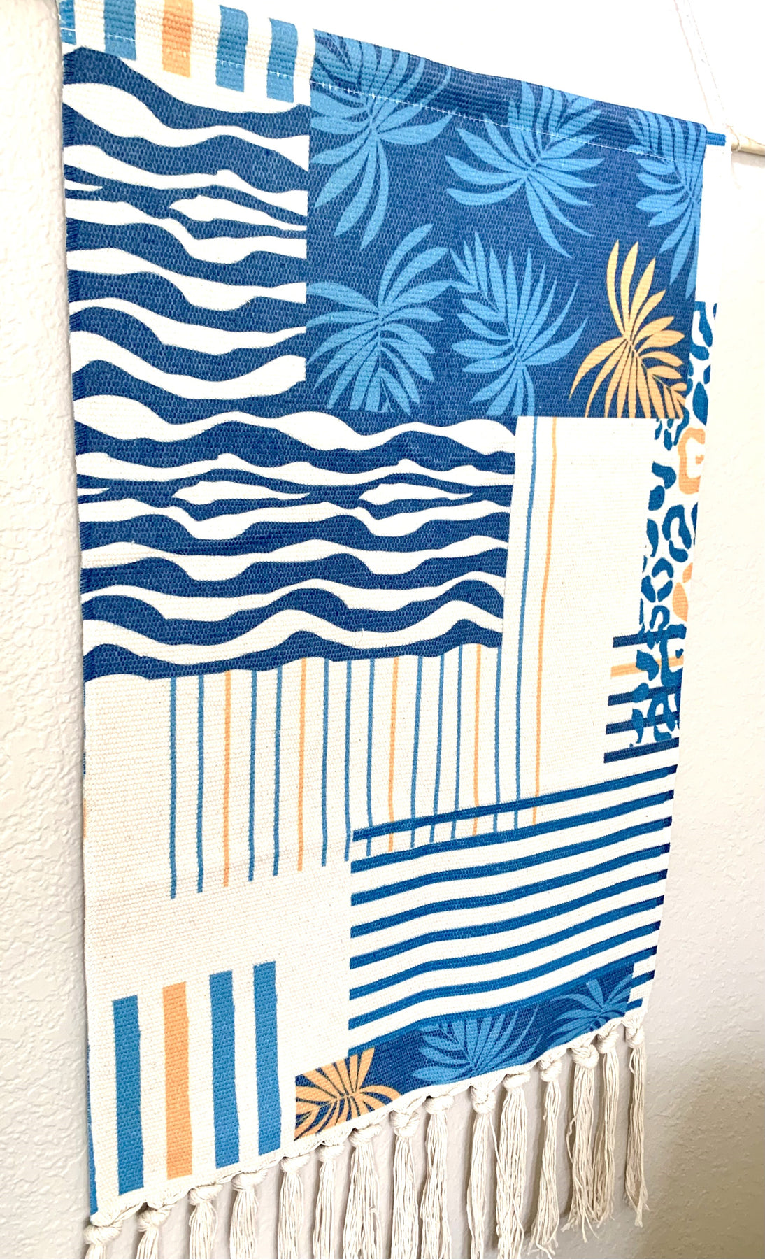 This is a fabulous tapestry invoking a feel of the tropics with its tropical leaf designs and wave imagery. Cool blues tones with contrasting orangish-yellow on a beige background further the beachy feel of the coast with waves gently crashing on the sand. This tapestry has a lot of contemporary visual appeal! Tassels accent the bottom, providing a nice textural and free-form look.
