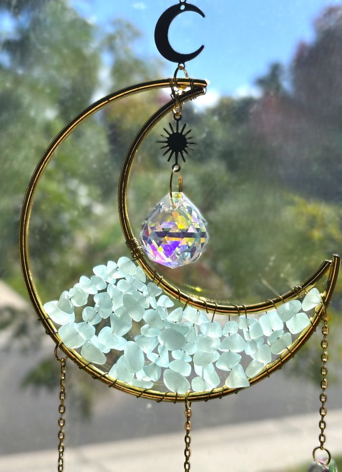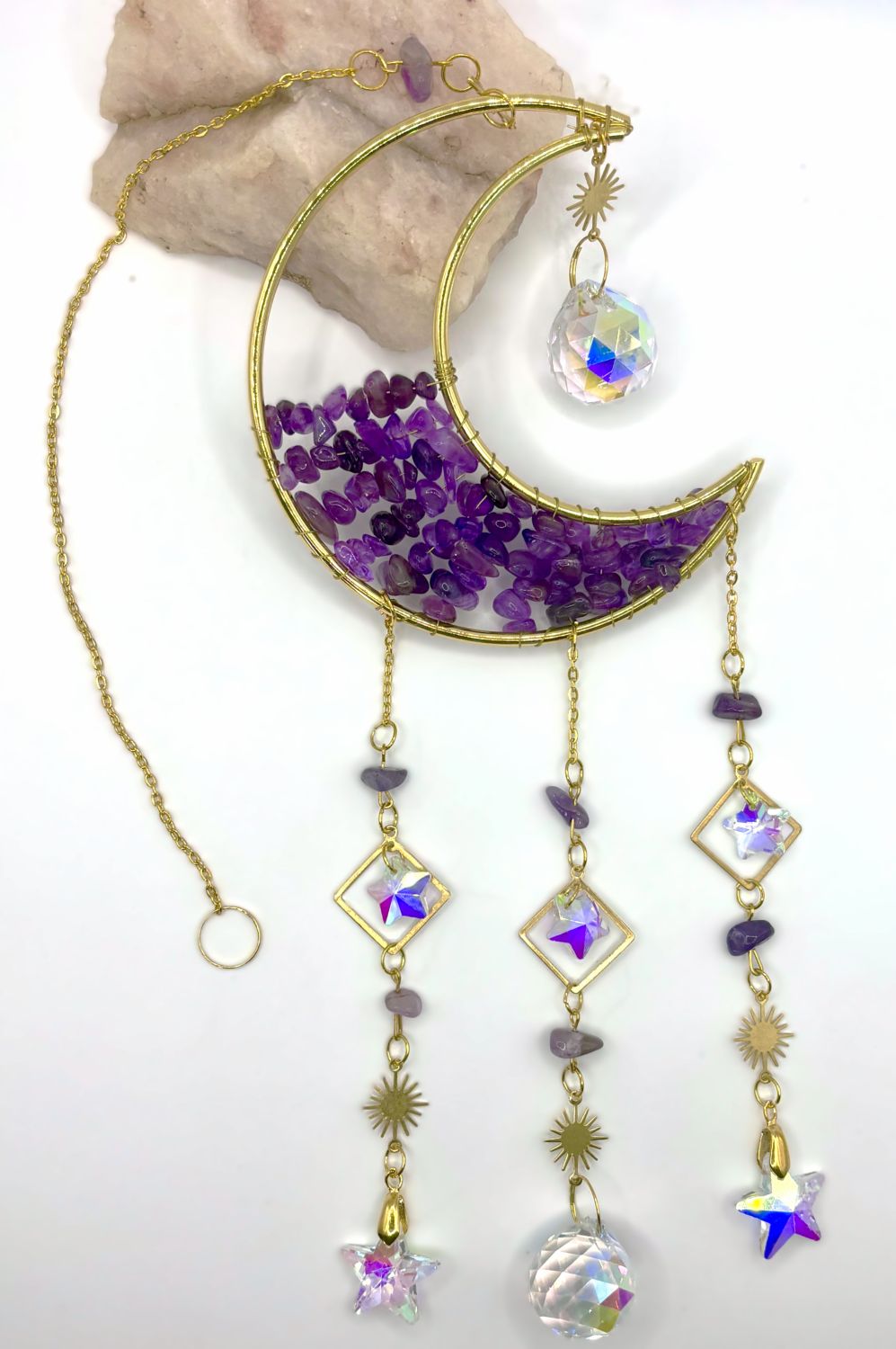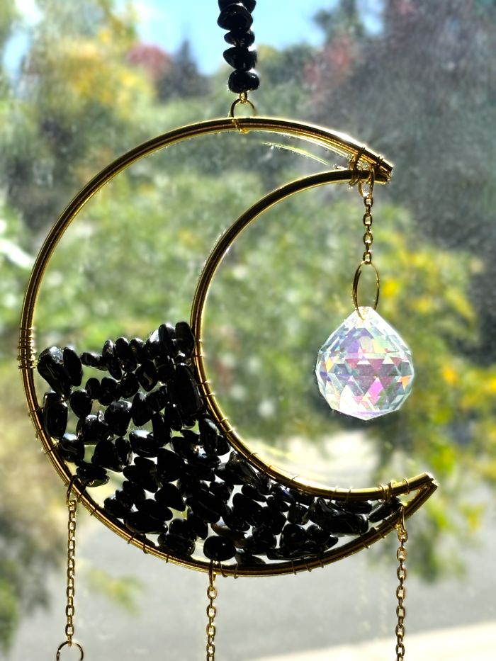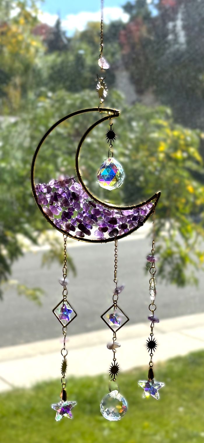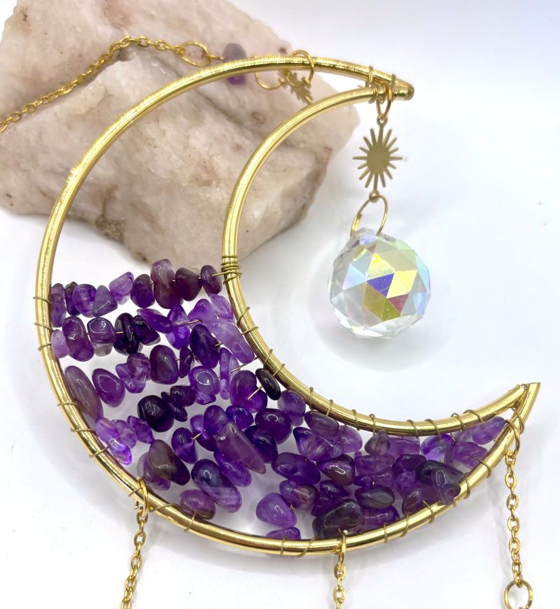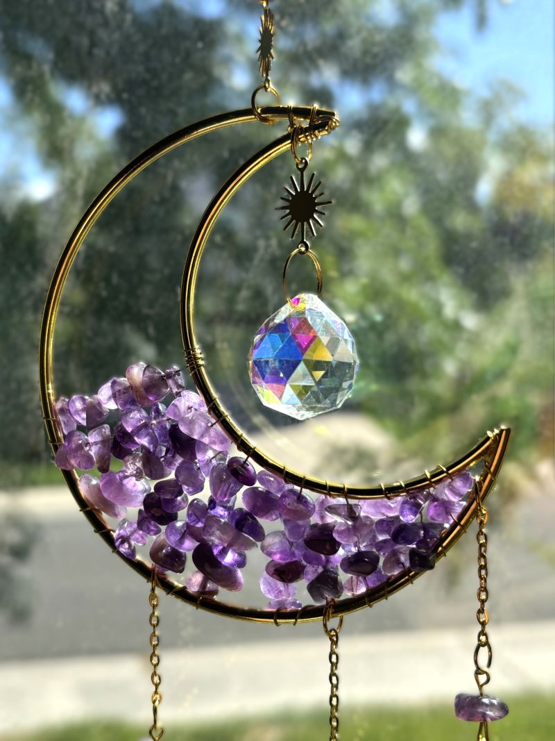 Elevate your space with these enchanting Crescent Moon Celestial Gemstone Sun Catchers, where celestial elegance meets natural beauty. Each piece showcases a lustrous gold crescent moon adorned with shimmering gemstone chips, suspended by a delicate chain embellished with celestial charms, gemstones, or both.